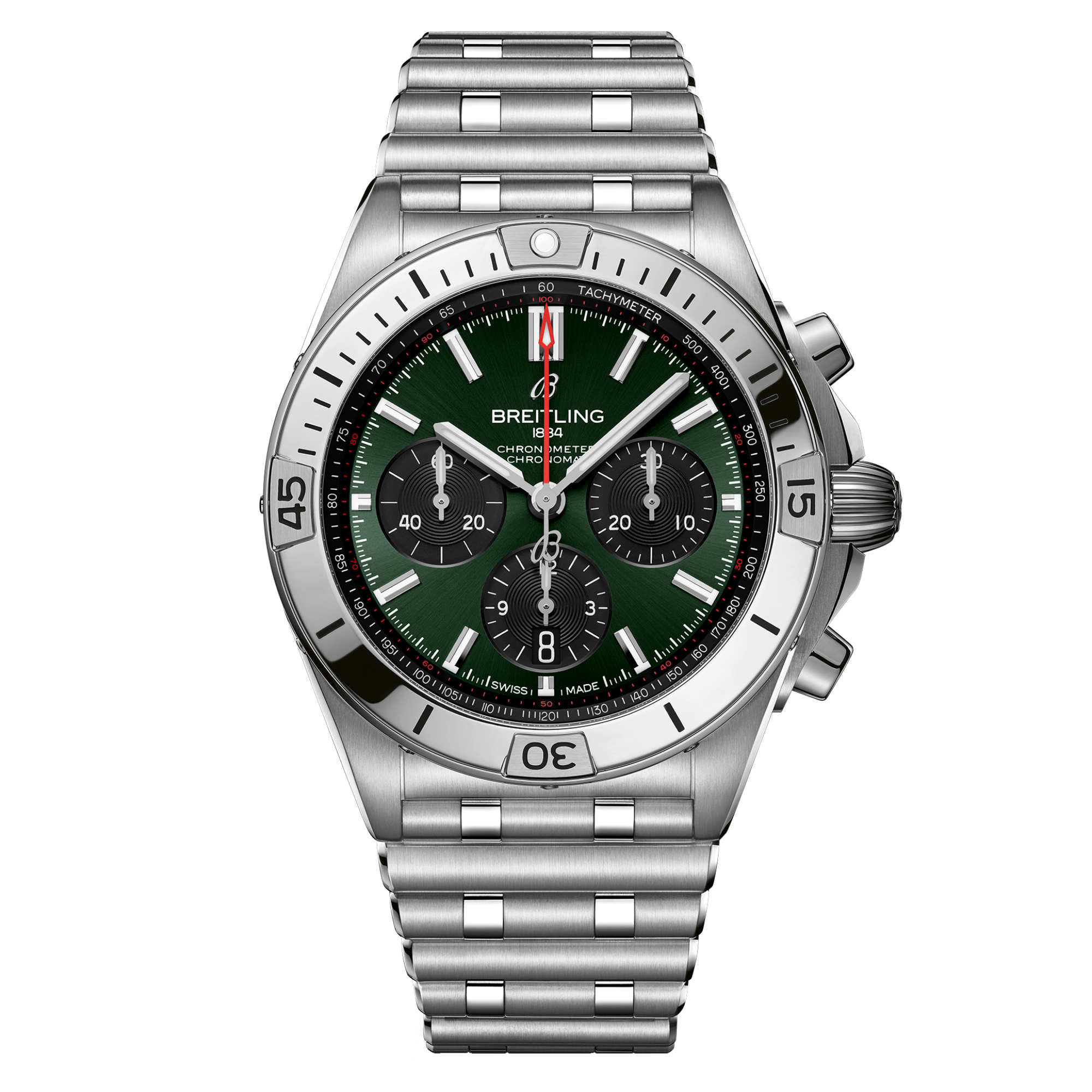 Das Modell verfügt über ein 42-mm-Gehäuse und die legendäre Lünette mit den vier Reitern. Die Chronomat ist mit verschiedenen farbenfrohen Zifferblättern lieferbar und auf das charakteristische Rouleaux-Armband aus Metall oder Kautschuk abgestimmt. Angetrieben wird das Modell vom Breitling-Manufakturkaliber 01, einem COSC-zertifizierten Chronometer.