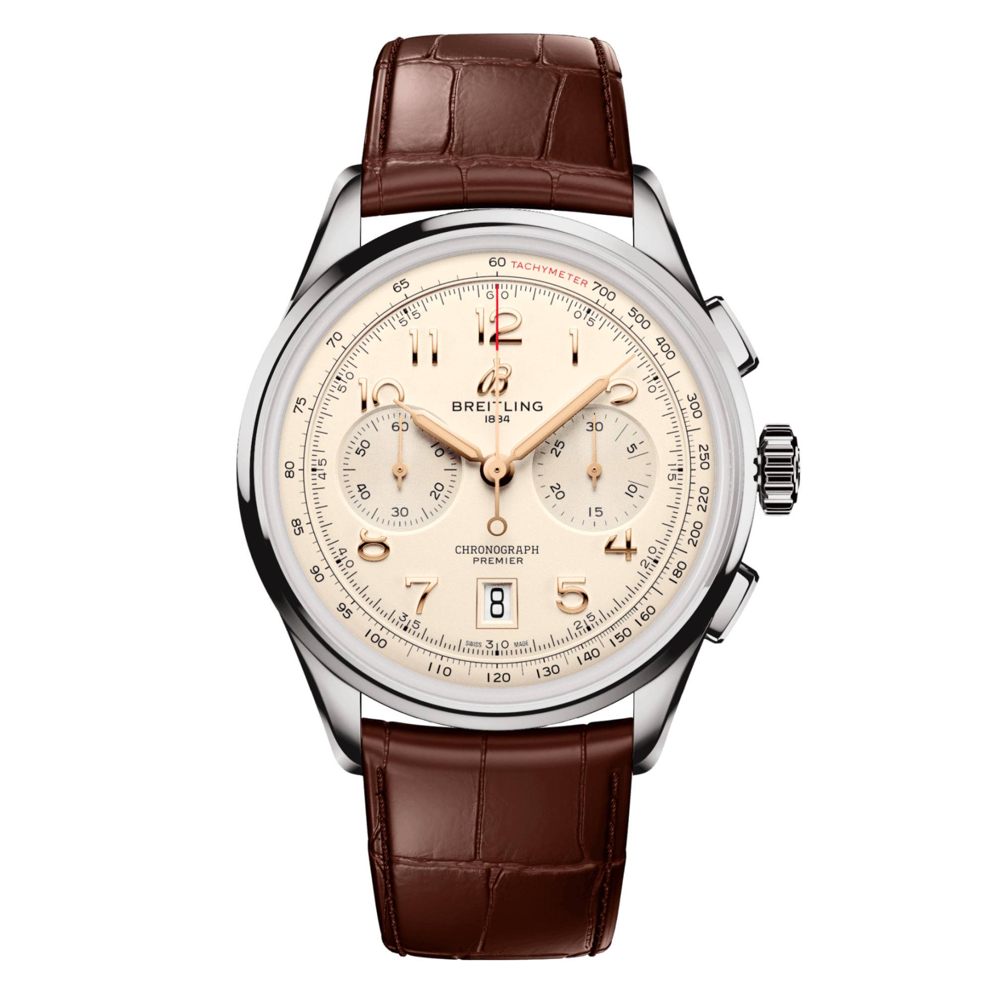 Ref. AB0145211G1P2 - Bereits Anfang der 1940er Jahre träumt Willy Breitling von einer Zeit nach dem Krieg, in der Nützlichkeit ungezügeltem Optimismus Platz machen würde. Er begann mit der Arbeit an einem Chronographen, der funktional, aber auch einzigartig elegant und unendlich lange tragbar sein sollte—in seinen Worten: «der unverwechselbare Stempel tadellosen Geschmacks.» Diese neue Linie nannte er «Premier». Beim Entwurf der neuen Premier bewahrte Breitling unverkennbare Vintage-Premier-Details wie die glatte feste Lünette, das Twin-Register-Zifferblatt, die eleganten rechteckigen Drücker und die aufgebrachten arabischen Ziffern. Der Premier B01 Chronograph 42 ist in verschiedenen Zifferblattfarben und Gehäusematerialien erhältlich. Sie ist wahlweise mit einem klassischen Alligatorlederarmband oder einem eleganten siebenreihigen Metallarmband erhältlich. Auch die heutige Premier entspricht den kompromisslosen technischen Standards von Willy Breitling mit ihrem aussergewöhnlichen Uhrwerk mit Selbstaufzug—dem COSC-zertifizierten Breitling-Manufakturkaliber 01—, welches auf höchste Präzision, Zuverlässigkeit und Funktionalität ausgelegt ist.