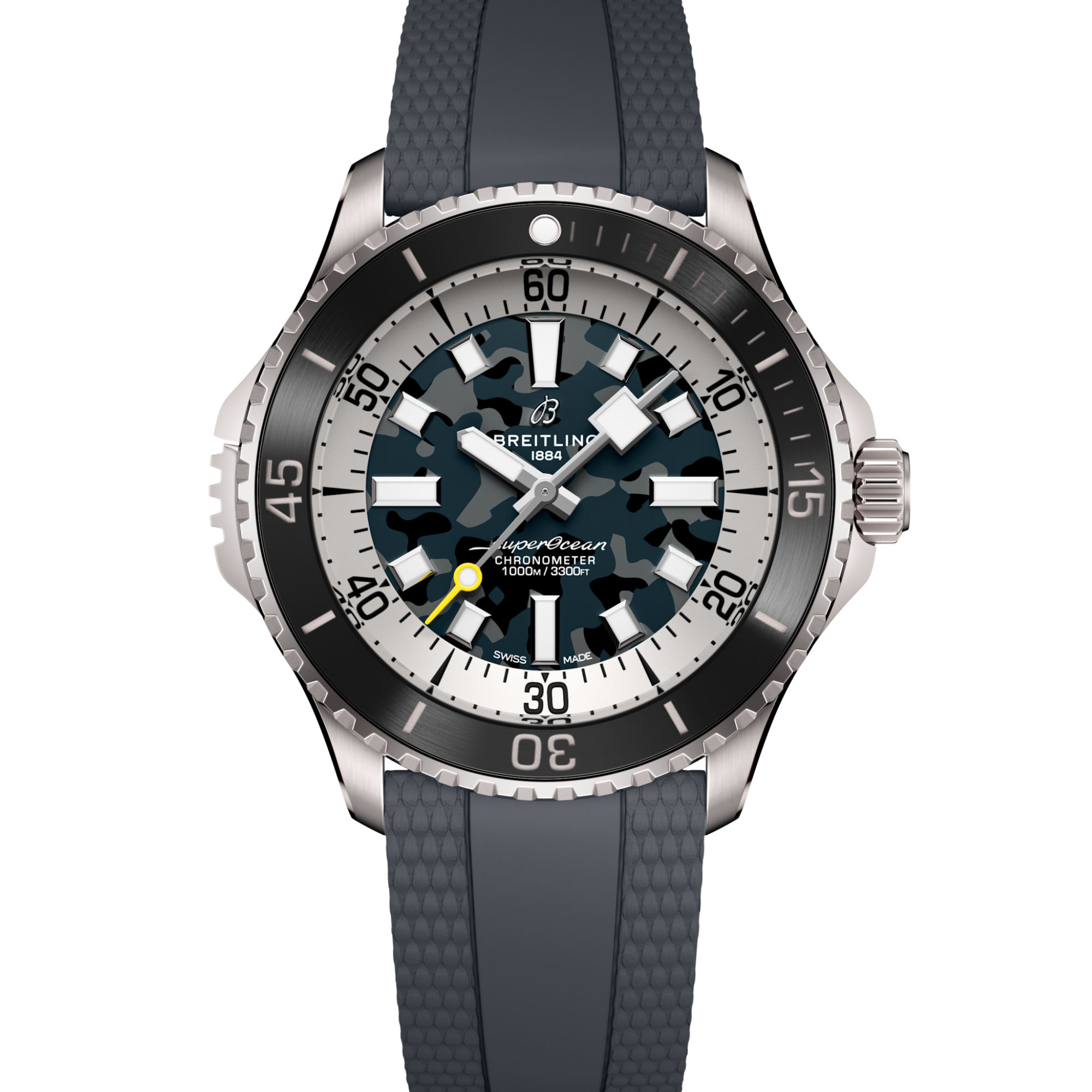 Die Superocean Automatic 46 Super Diver nimmt die gefeierten Designelemente der Slow Motion wieder auf und ergänzt sie mit modernen Funktionen wie einer kratzfesten, matten Keramikinlay-Lünette und Camouflage-Zifferblättern. Breite Zeiger und Indizes in lumineszierenden Super-LumiNova® Farben sorgen für eine gute Ablesbarkeit (und zusätzlichen Spass) unter Wasser. Die Uhr ist wasserdicht bis 1000 Meter (3300 Fuss), stossfest sowie sand- und salzwasserbeständig. Ihr Weicheisen-Innengehäuse schützt gegen Magnetfeldstrahlung, und über eine Sicherungssperre auf der linken Gehäuseseite kann die bidirektionale Drehlünette arretiert werden.