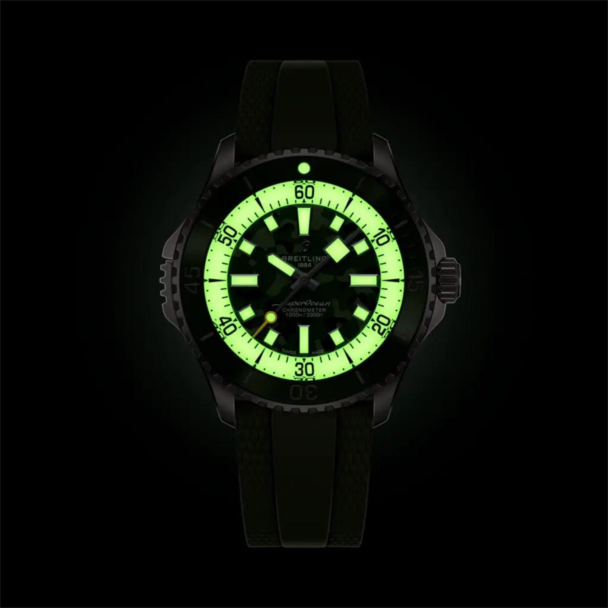 Die Superocean Automatic 46 Super Diver nimmt die gefeierten Designelemente der Slow Motion wieder auf und ergänzt sie mit modernen Funktionen wie einer kratzfesten, matten Keramikinlay-Lünette und Camouflage-Zifferblättern. Breite Zeiger und Indizes in lumineszierenden Super-LumiNova® Farben sorgen für eine gute Ablesbarkeit (und zusätzlichen Spass) unter Wasser. Die Uhr ist wasserdicht bis 1000 Meter (3300 Fuss), stossfest sowie sand- und salzwasserbeständig. Ihr Weicheisen-Innengehäuse schützt gegen Magnetfeldstrahlung, und über eine Sicherungssperre auf der linken Gehäuseseite kann die bidirektionale Drehlünette arretiert werden.