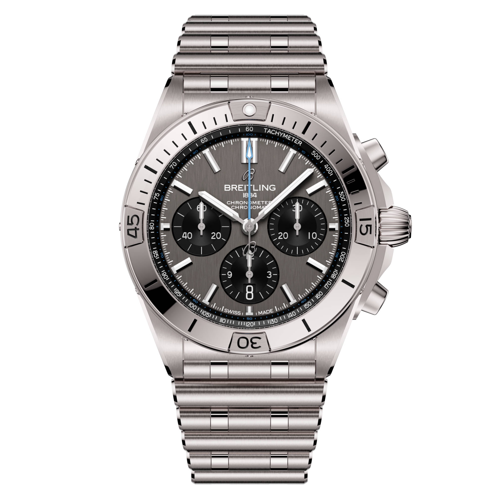 Die in verschiedenen Materialien wie Edelstahl, 18-karätigem Rotgold und Titan erhältliche Chronomat verfügt über ein Gehäuse von 42 mm und eine unverwechselbare Lünette mit vier Reitern bei den Viertelstundenindizes. Sie ist mit verschiedenen farbenfrohen Zifferblättern erhältlich und auf das charakteristische Rouleaux-Armband aus Metall oder Kautschuk abgestimmt. Originalgetreu wird die Chronomat vom Breitling-Manufakturkaliber 01, einem COSC-zertifizierten Chronometer, angetrieben.