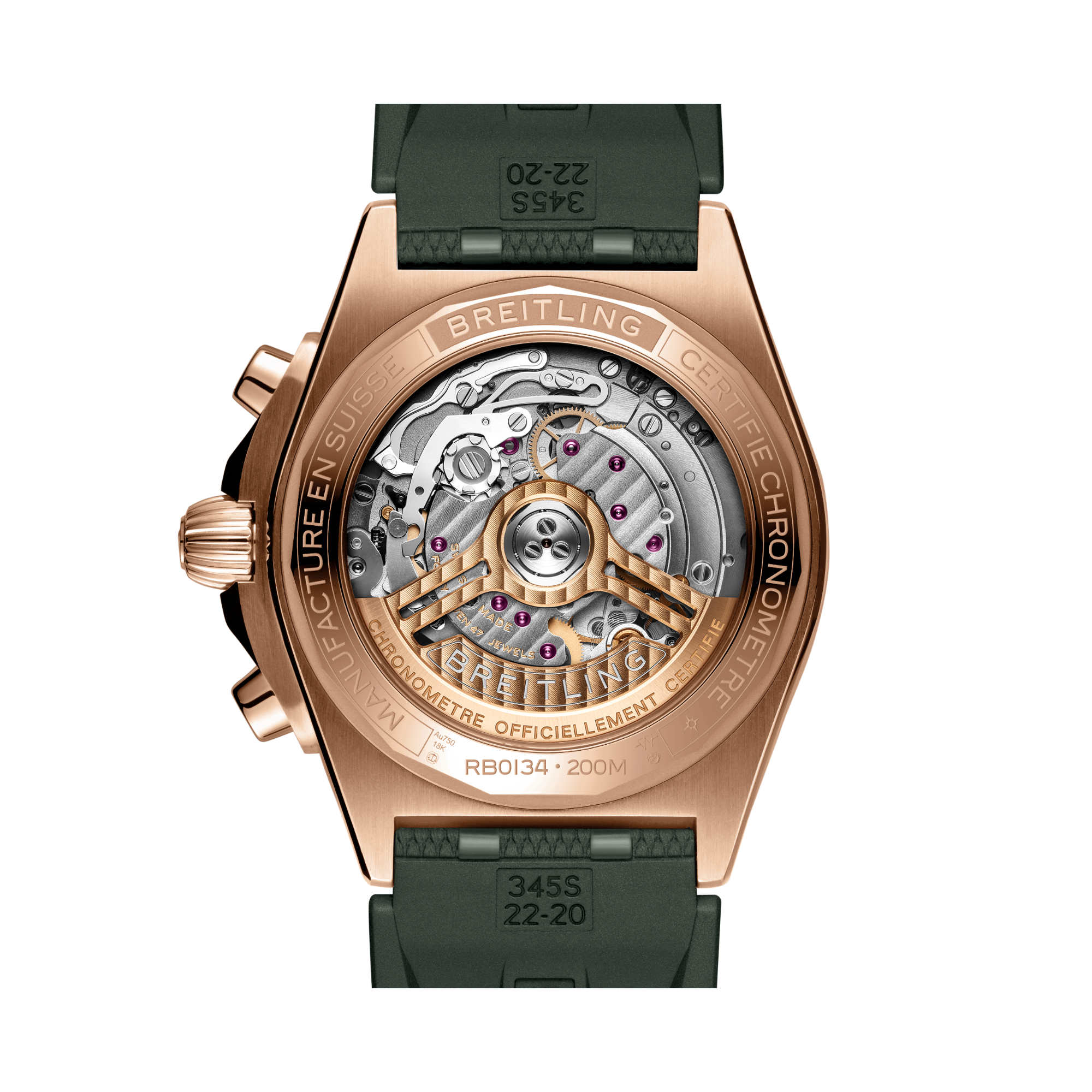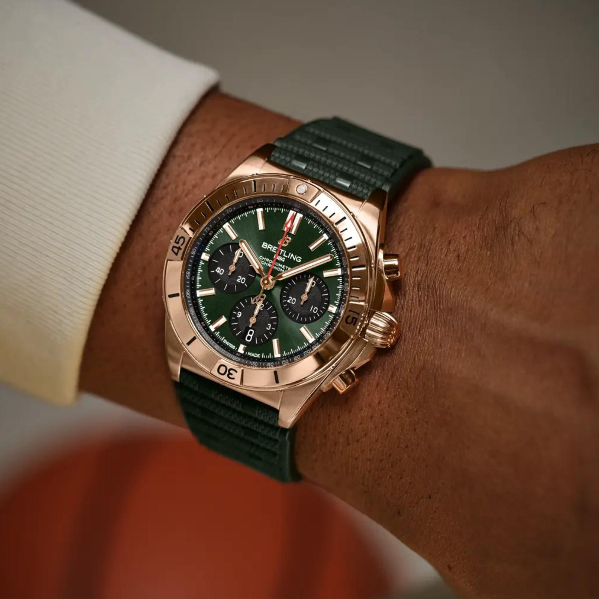 Das Modell verfügt über ein 42-mm-Gehäuse und die legendäre Lünette mit den vier Reitern. Die Chronomat ist mit verschiedenen farbenfrohen Zifferblättern lieferbar und auf das charakteristische Rouleaux-Armband aus Metall oder Kautschuk abgestimmt. Angetrieben wird das Modell vom Breitling-Manufakturkaliber 01, einem COSC-zertifizierten Chronometer.