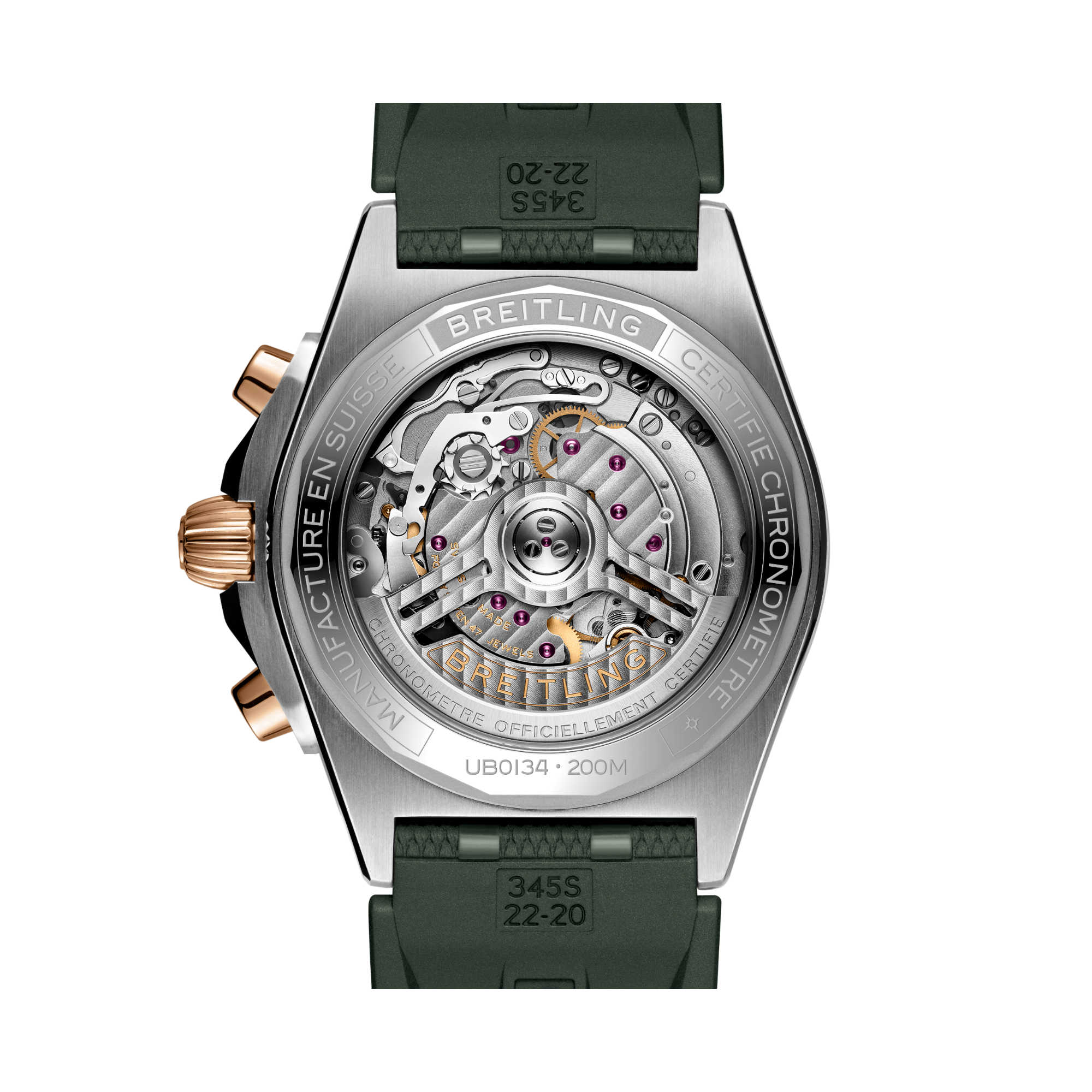 Das Modell verfügt über ein 42-mm-Gehäuse und die legendäre Lünette mit den vier Reitern. Die Chronomat ist mit verschiedenen farbenfrohen Zifferblättern lieferbar und auf das charakteristische Rouleaux-Armband aus Metall oder Kautschuk abgestimmt. Angetrieben wird das Modell vom Breitling-Manufakturkaliber 01, einem COSC-zertifizierten Chronometer.