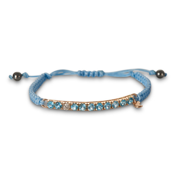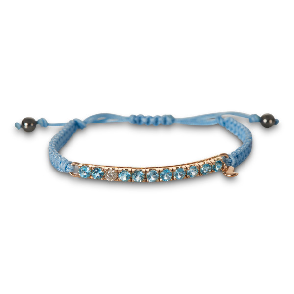 Ref. P775B/TA - Tennisarmband aus 18-karätigem Roségold mit Granaten, weißem Diamant und Makramee in Himmelblau.