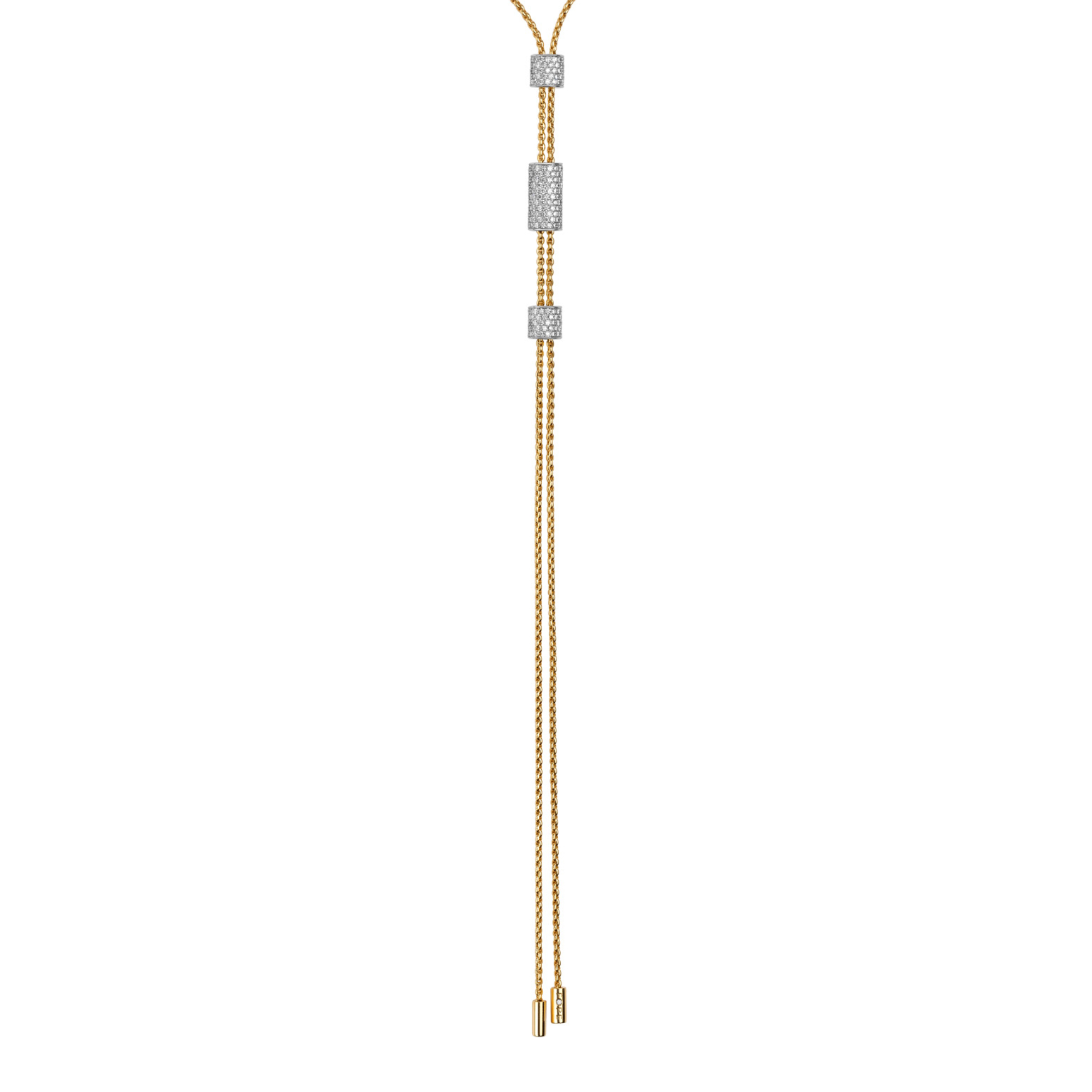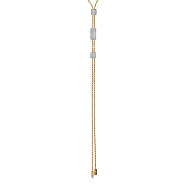 Ref. 89603CX_BB_G_GBX_090 - Aria besteht aus einer neuen zarten, feinmaschigen Goldkette und richtet sich an aufstrebende Luxuskonsumenten, die den Athleisure-Modetrend aufgreifen. Die Stücke der Aria-Kollektion (Ohrringe und Halsketten) wurden so entworfen, dass sie in den drei Goldfarben gemischt und aufeinander abgestimmt werden können, mit goldenen Zylindern, die mit weißen oder schwarzen Diamanten besetzt sind, für Damen und Herren.
