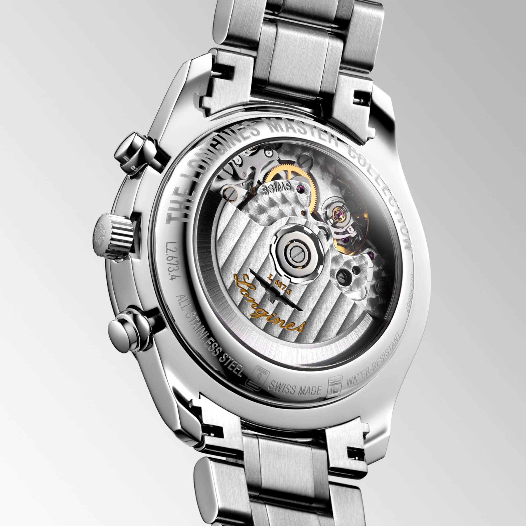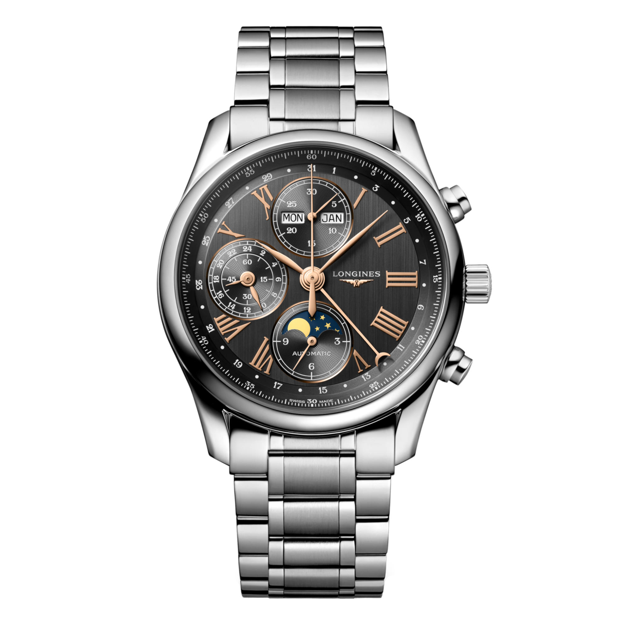 Säulenradchronograph: Zentraler 60-Sekunden-Zeiger, Mondphasenanzeige mit 12-Stunden-Zähler bei 6 Uhr, 30-Minuten-Zähler mit Wochentag- und Monatsanzeige bei 12 Uhr