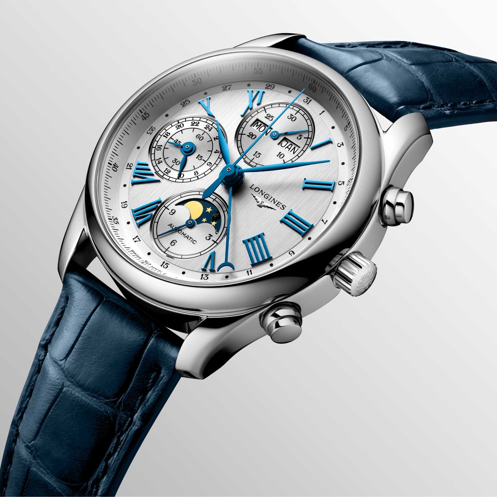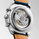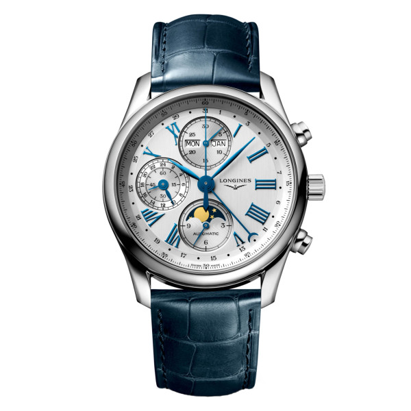 Chronograph: Zentraler 60-Sekunden-Zeiger, Mondphasenanzeige mit 12-Stunden-Zähler bei 6 Uhr, 30-Minuten-Zähler mit Wochentag- und Monatsanzeige bei 12 Uhr