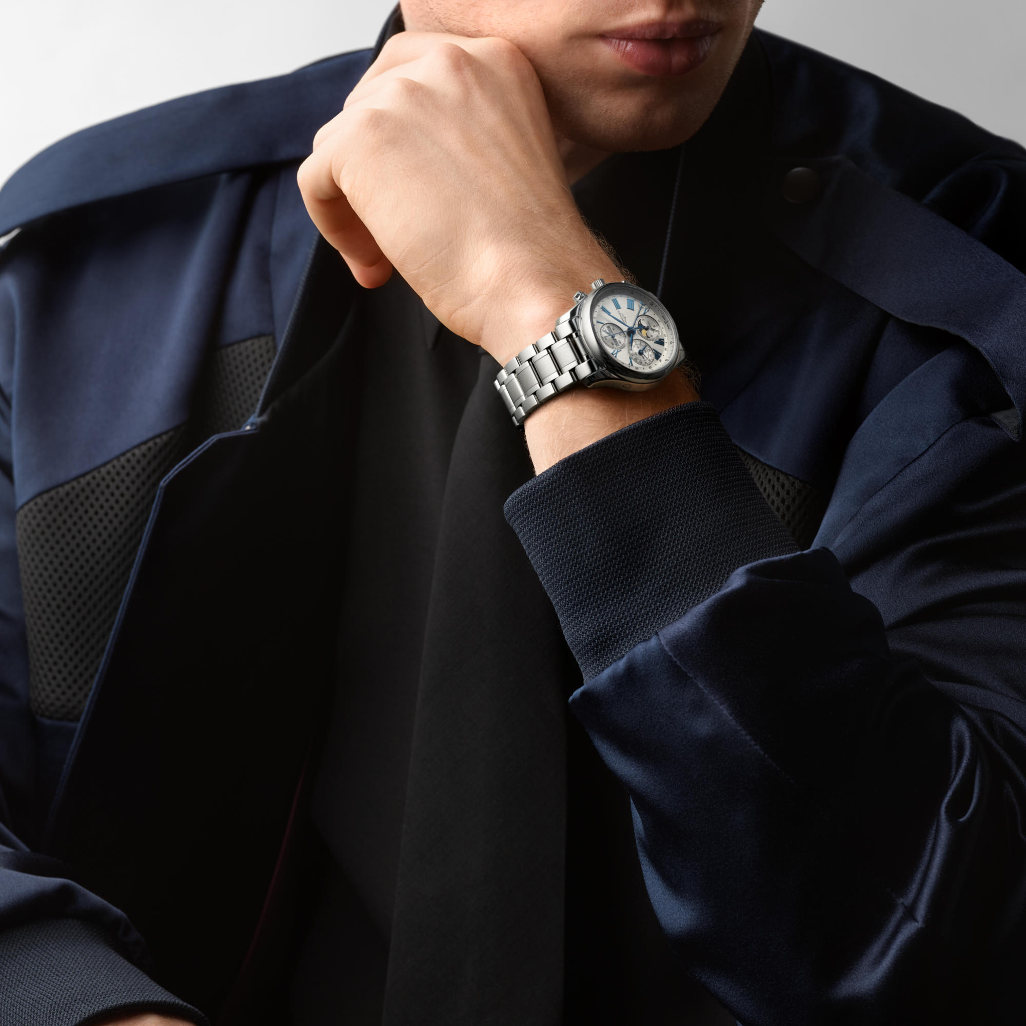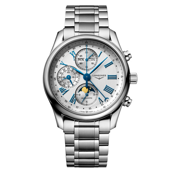 Chronograph: Zentraler 60-Sekunden-Zeiger, Mondphasenanzeige mit 12-Stunden-Zähler bei 6 Uhr, 30-Minuten-Zähler mit Wochentag- und Monatsanzeige bei 12 Uhr