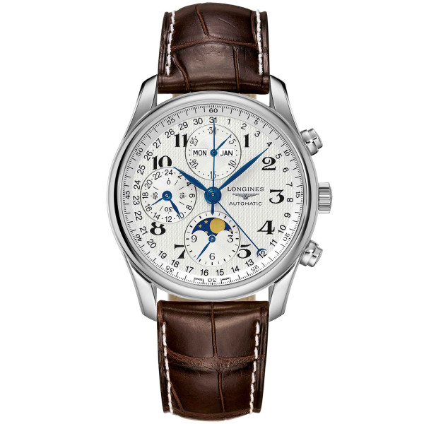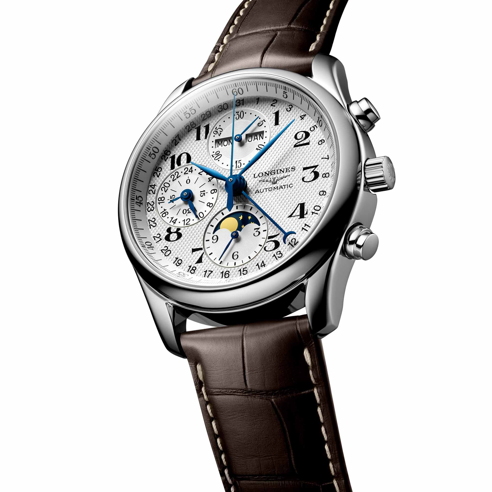 Chronograph: Zentraler 60-Sekunden-Zeiger, Mondphasenanzeige mit 12-Stunden-Zähler bei 6 Uhr