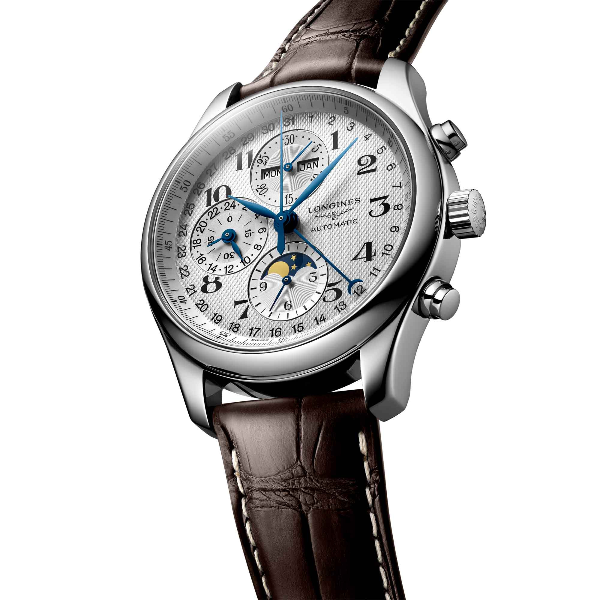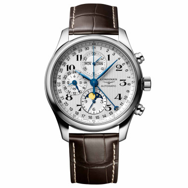 Chronograph: Zentraler 60-Sekunden-Zeiger, Mondphasenanzeige mit 12-Stunden-Zähler bei 6 Uhr, 30-Minuten-Zähler mit Wochentag- und Monatsanzeige bei 12 Uhr