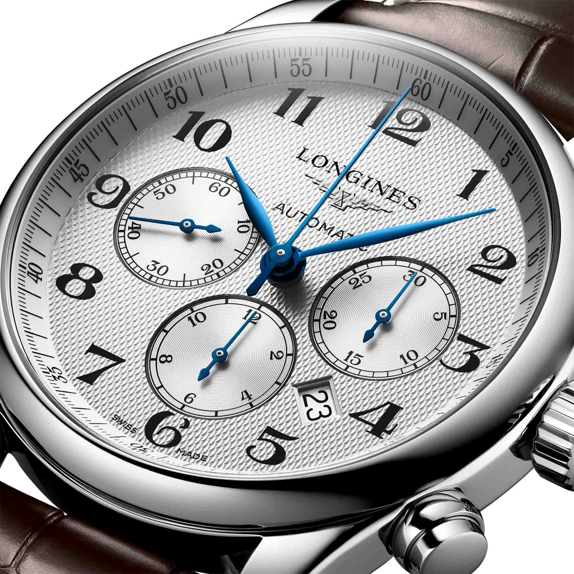 Stunde, Minute, Sekunde, Datum, kleine Sekunde, Chronograph, zentraler 60-Sekunden-Zeiger und 30-Minuten-Zähler, 12-Stunden-Zähler