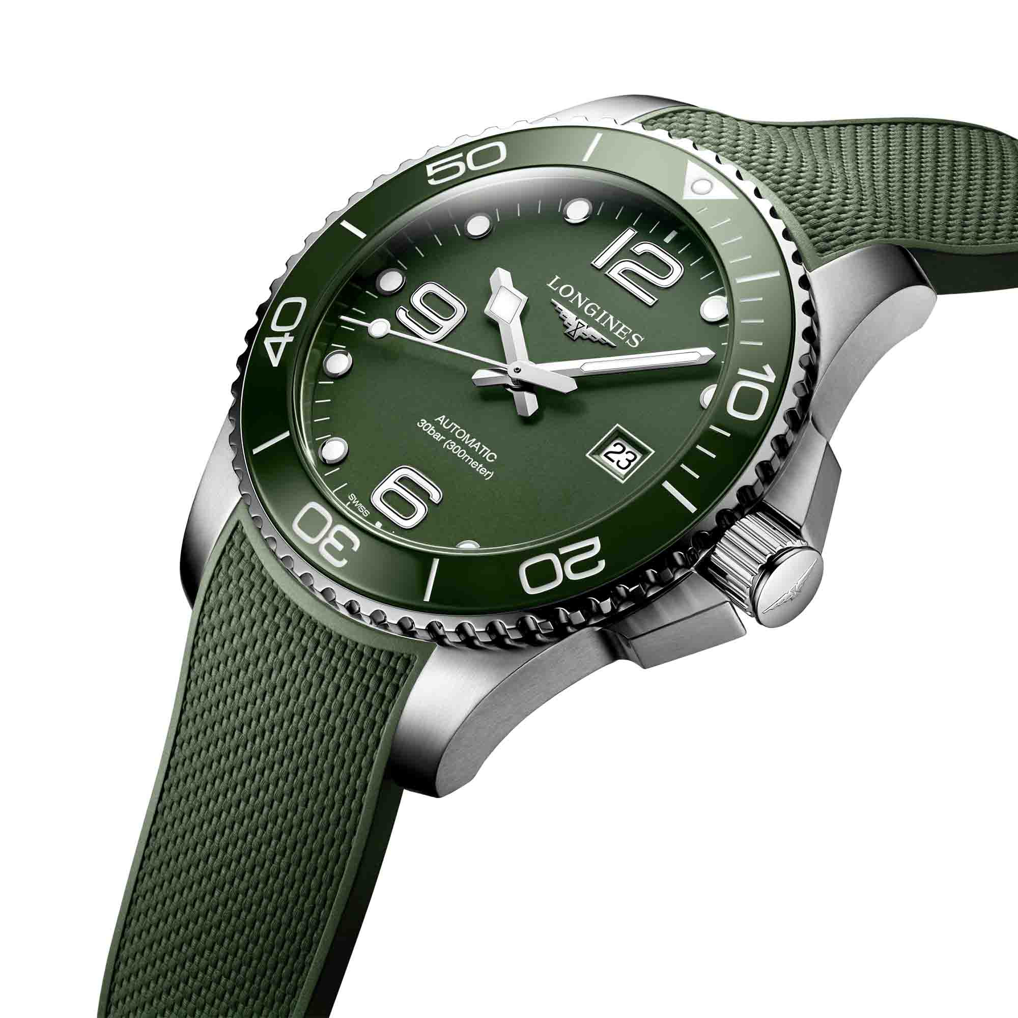 Grünes Kautschukarmband mit doppelter Sicherheitsfaltschließe und Drückern