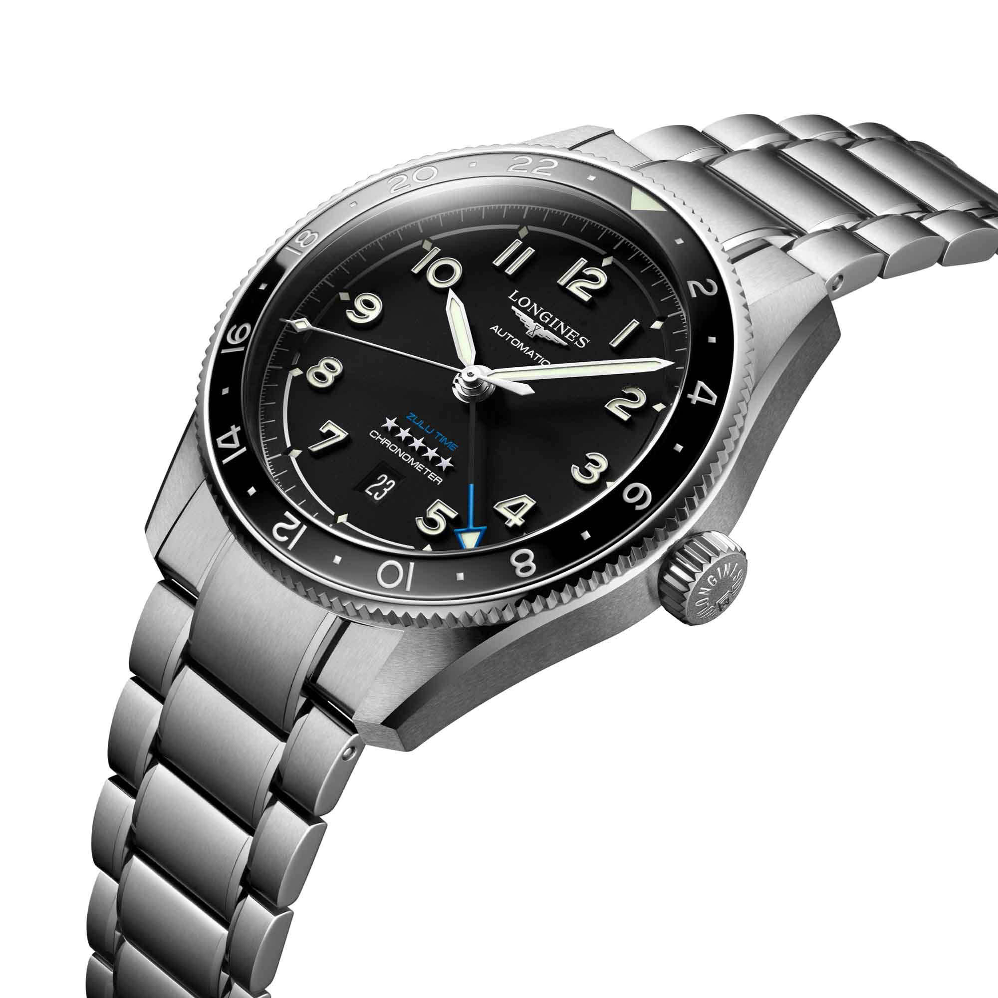 Gravierte 24-Stunden-Skala mit lackierten Ziffern und Dreieck mit Super-LumiNova®-Beschichtung