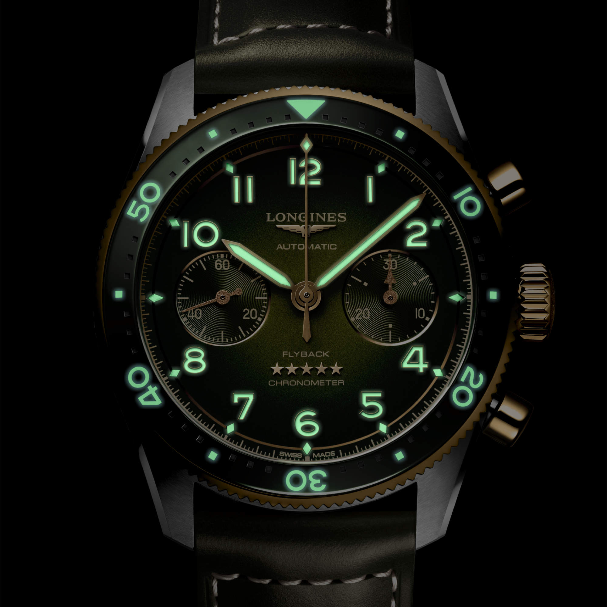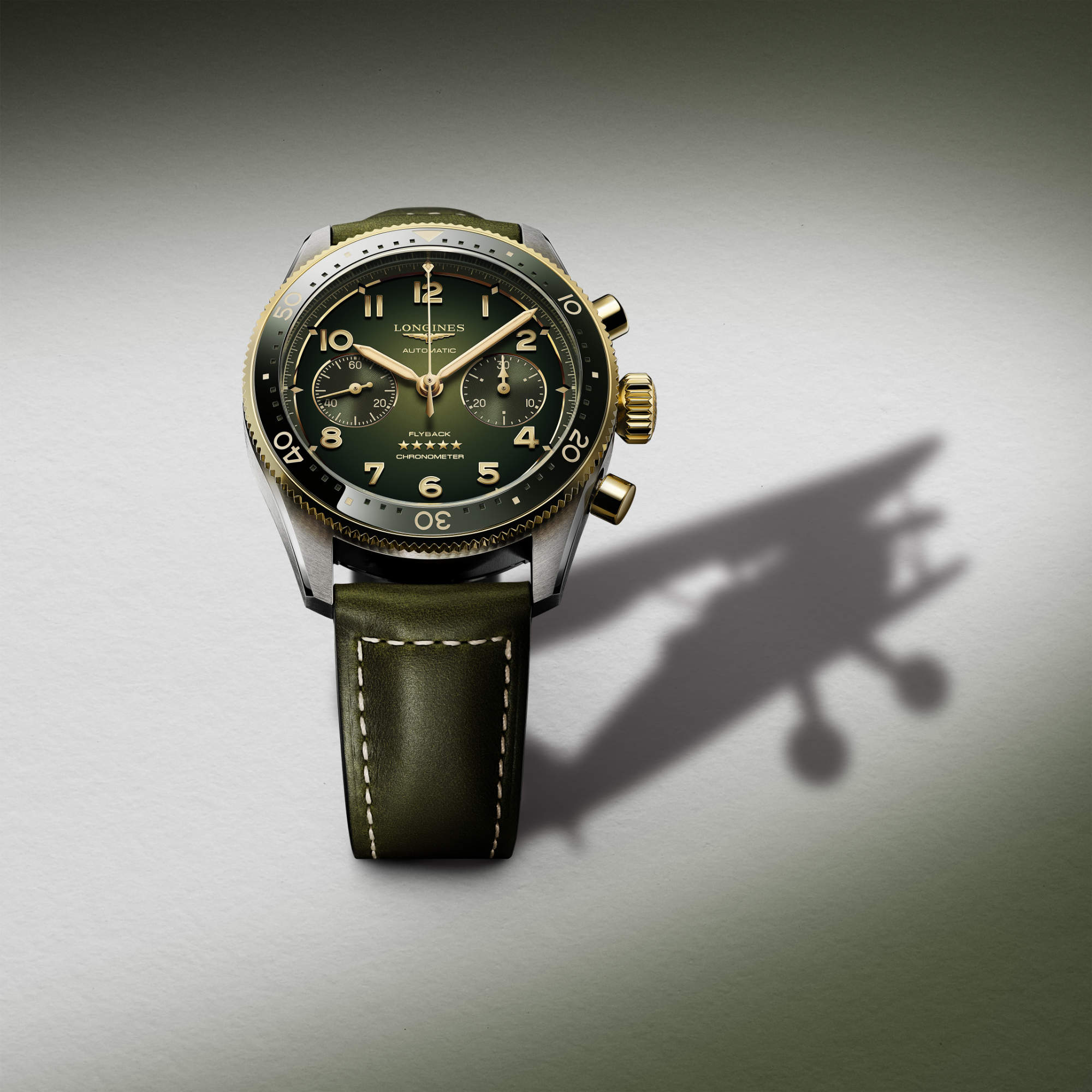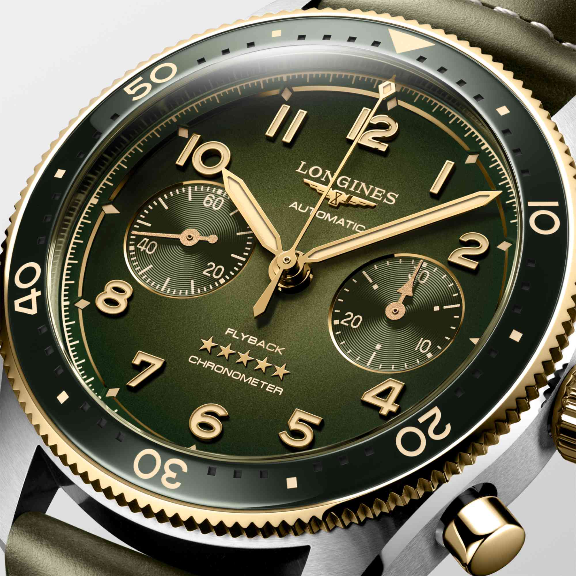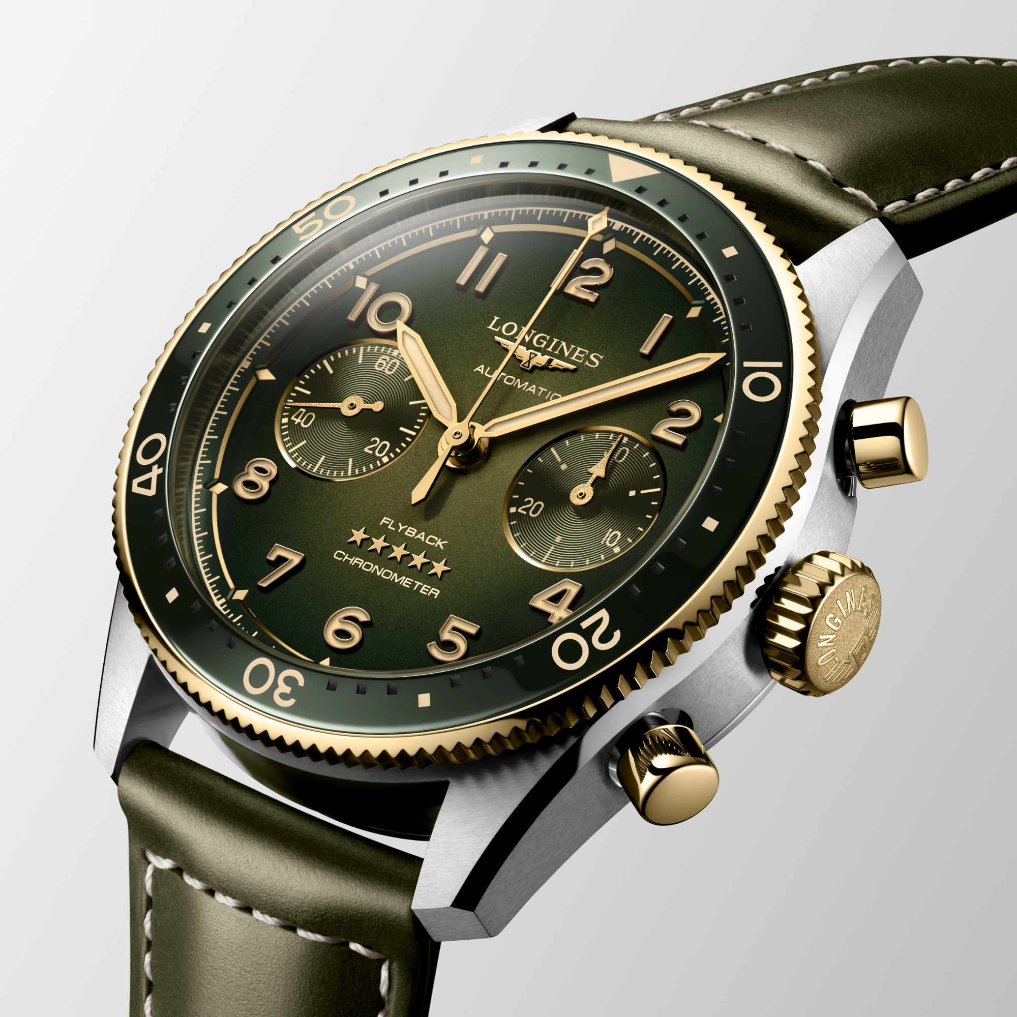Ref. L3.821.5.53.2 - Die Longines Spirit Flyback hat einen Durchmesser von 42 mm, ein mattgrünes Zifferblatt mit Flyback-Funktion, eine Kappe, eine Krone und Drücker aus 18 Karat Gelbgold. Sie ist bis zu 10 bar (100 Meter) wasserdicht und wird von einem exklusiven, von der COSC als Chronometer zertifiziertem Kaliber von Longines angetrieben, welches eine Gangreserve von bis zu 68 Stunden hat.