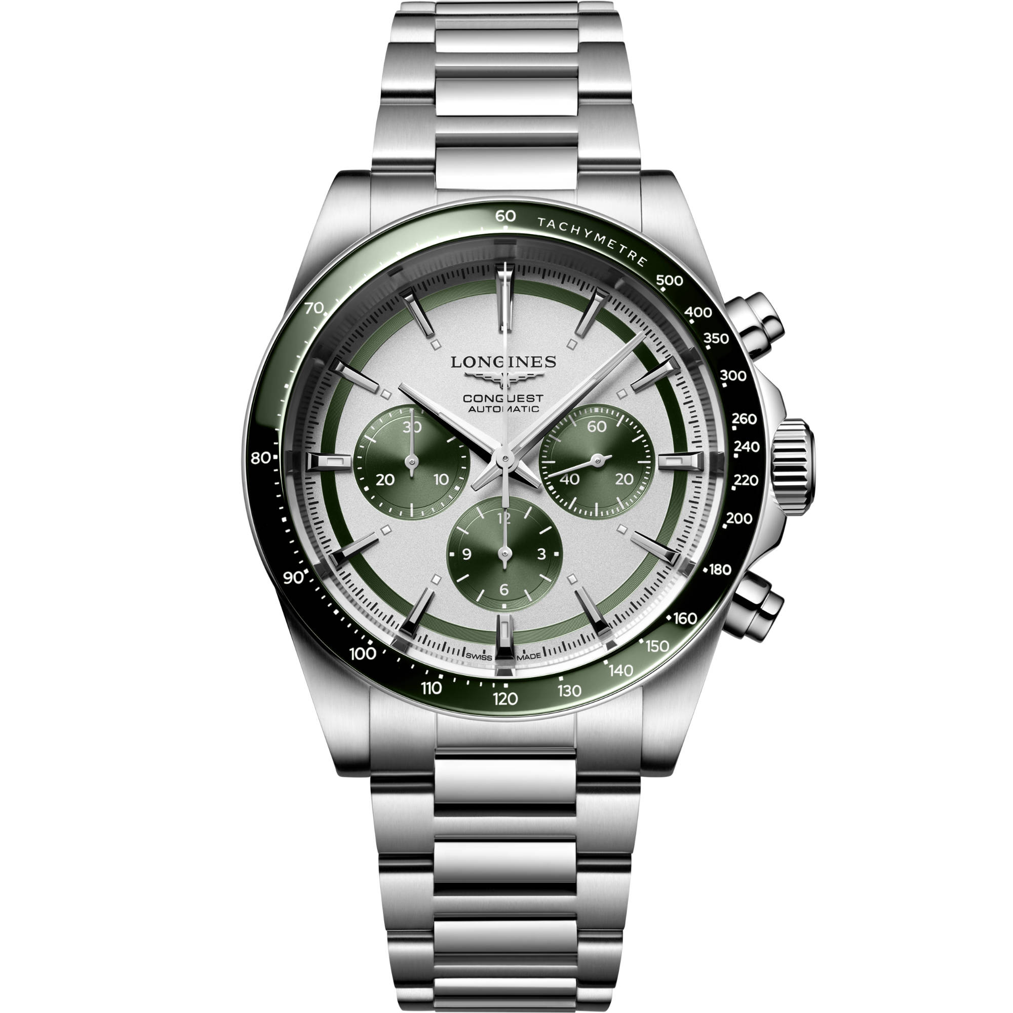 Chronograph: Zentraler 60-Sekunden-Zeiger, 12-Stunden-Zähler bei 6 Uhr und 30-Minuten-Zähler bei 9 Uhr