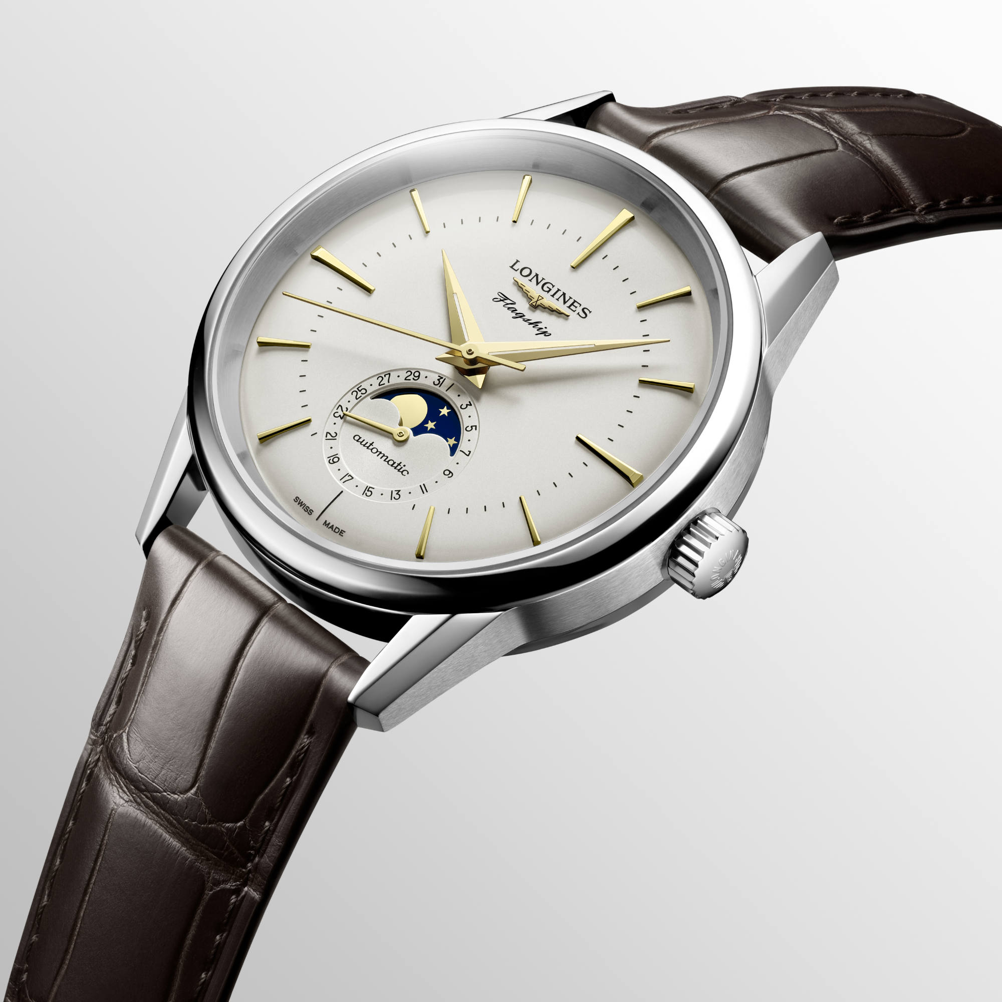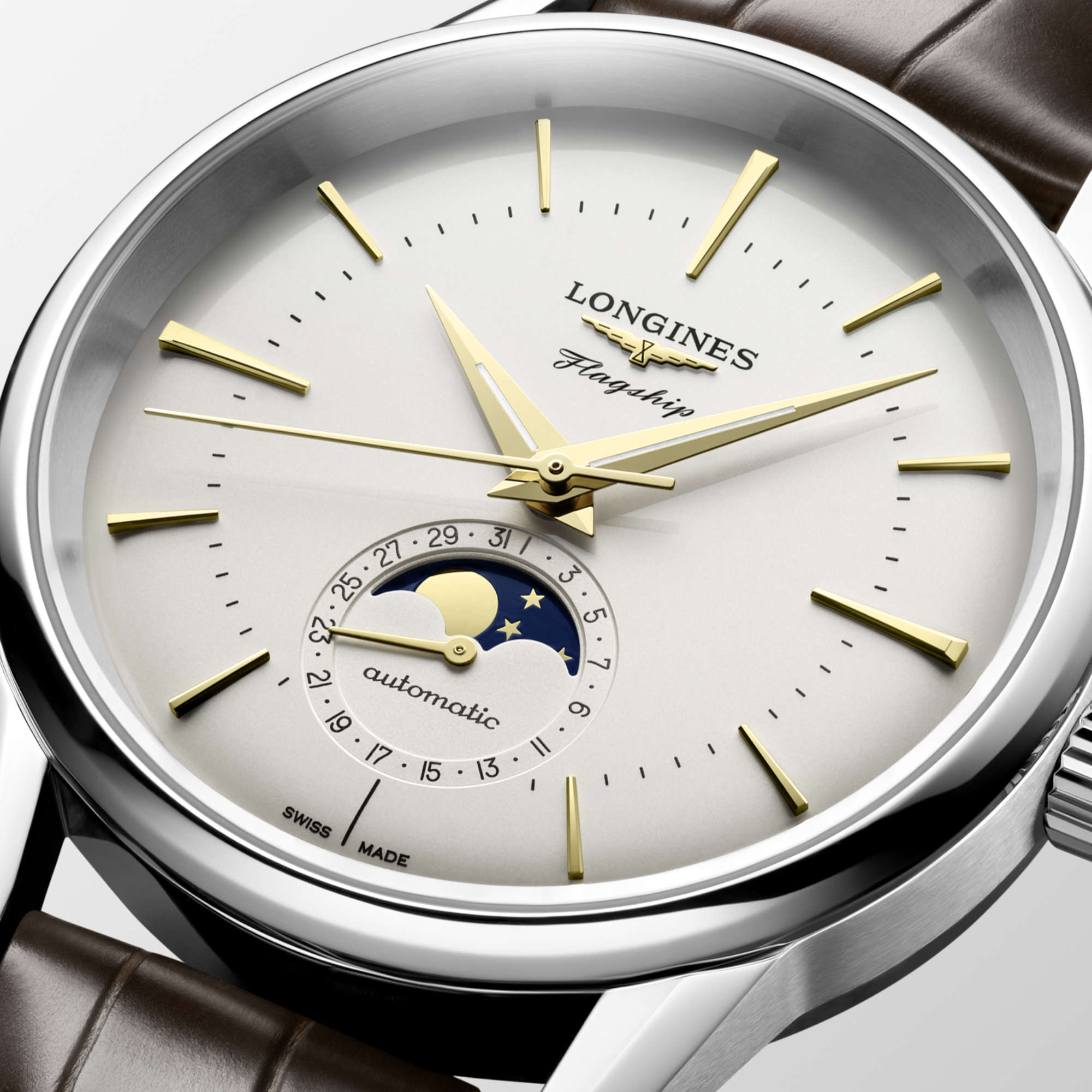Stunden, Minuten, Sekunden, Mondphasenanzeige und Datumsanzeige durch einen kleinen Zeiger bei 6 Uhr