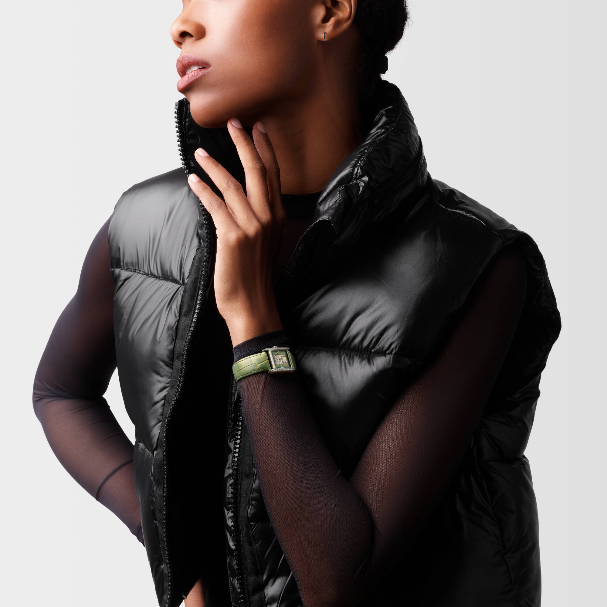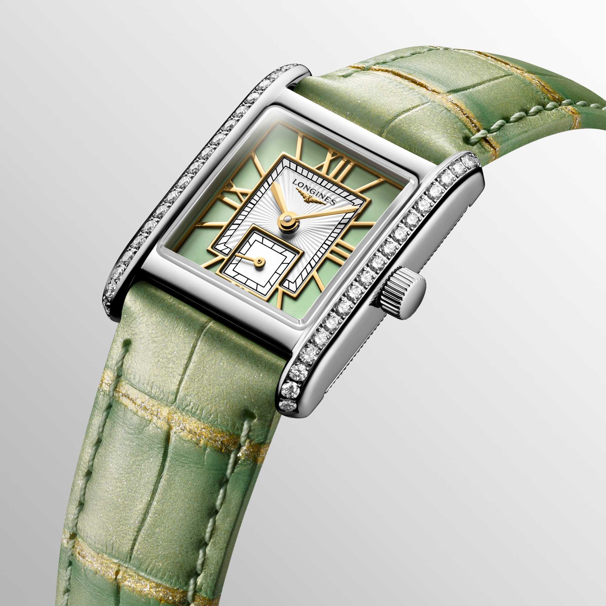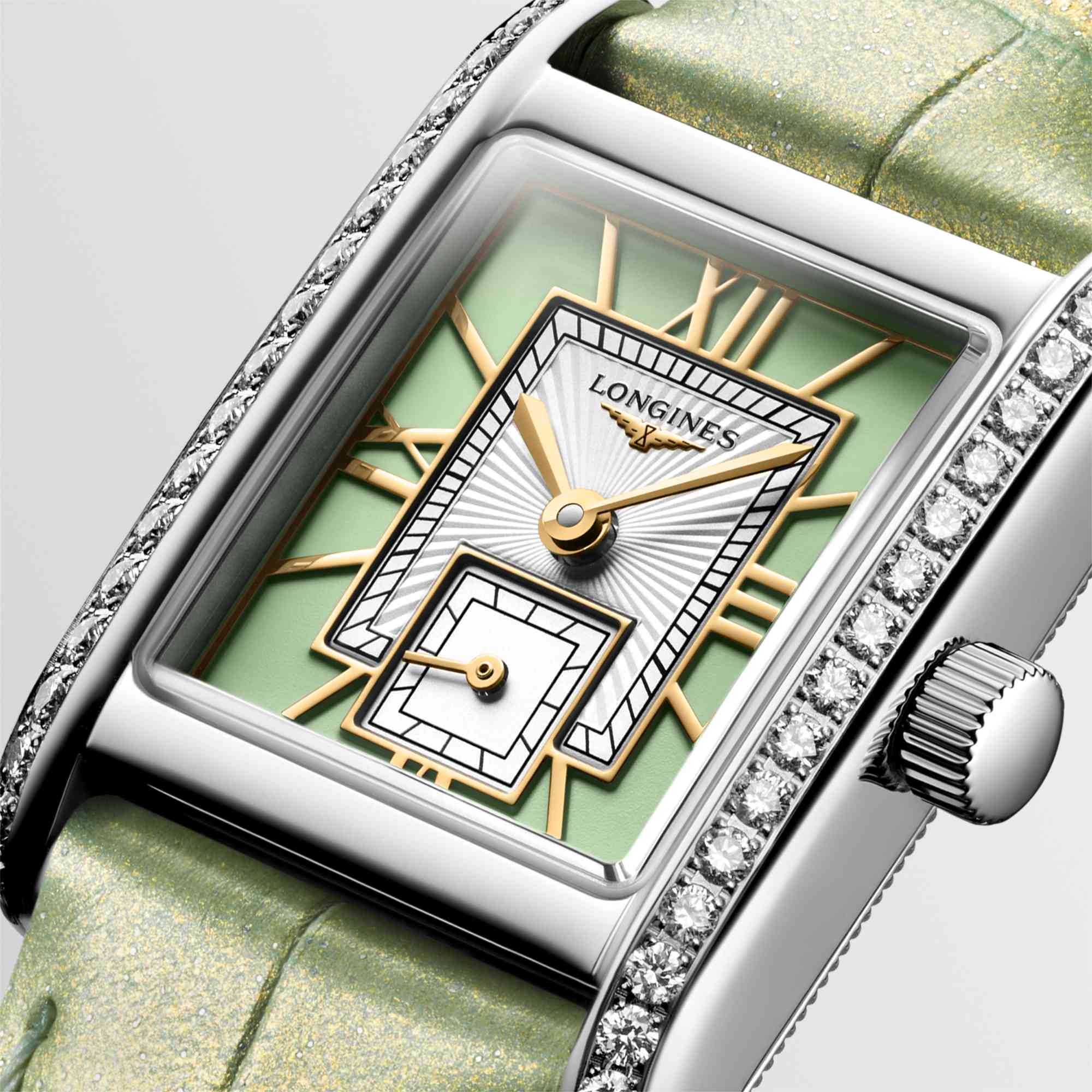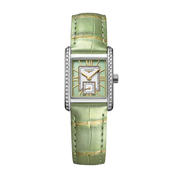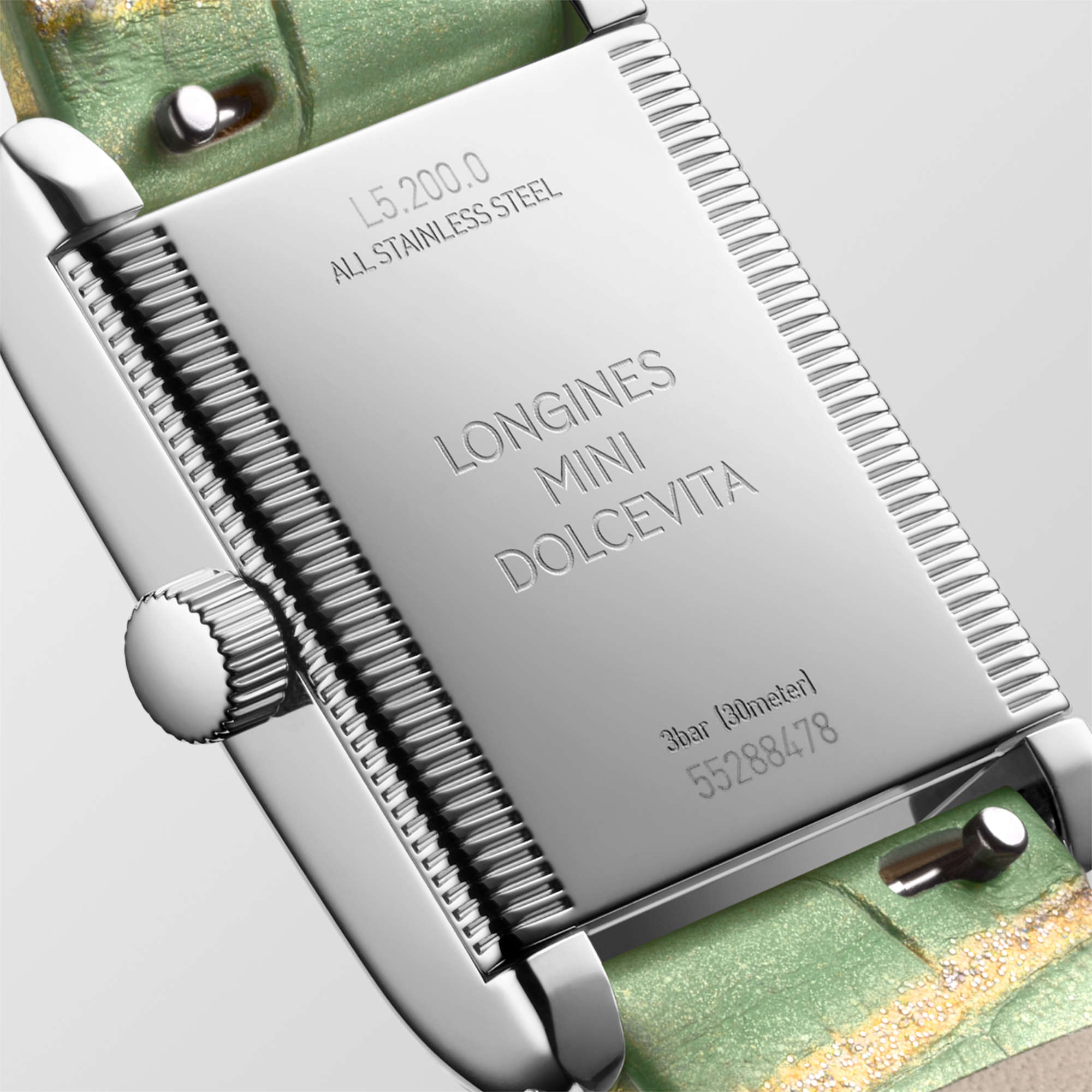 Ref. L5.200.0.05.2 - Die Mini DolceVita mag zwar klein sein, aber dafür kündigt sie ihre Ankunft umso größer an. Mit ihrem dezenten Profil, dem klassischen Design und den ästhetischen Variationen, die zugleich modern und zeitlos sind, ist sie ein kleines, aber mächtiges Meisterstück, das den unaufdringlichen Luxus und die zeitgenössische Eleganz von Longines gleichermaßen hervorragend zum Ausdruck bringt. Jede Referenz der Mini DolceVita Kollektion besitzt ein rechteckiges 21,50 mm x 29,00 mm großes Edelstahlgehäuse und wird von einem höchst präzisen L178 Quarz-Uhrwerk angetrieben. Dieses Modell besticht durch ein Gehäuse, das von 38 IF- VVS Top Wesselton Diamanten umrahmt ist. Es ist in einer von vier markanten, trendigen Farben erhältlich – Elfenbeinweiß, Mintgrün, Blütenrosa und Brilliantblau. Die Alligator-Lederarmbänder sind farblich auf das äußere Quadrat des römischen rechteckigen Zifferblatts abgestimmt. Ein wirkungsvoller Kontrast wird durch ein inneres Quadrat mit Guilloche-Effekt geschaffen.
