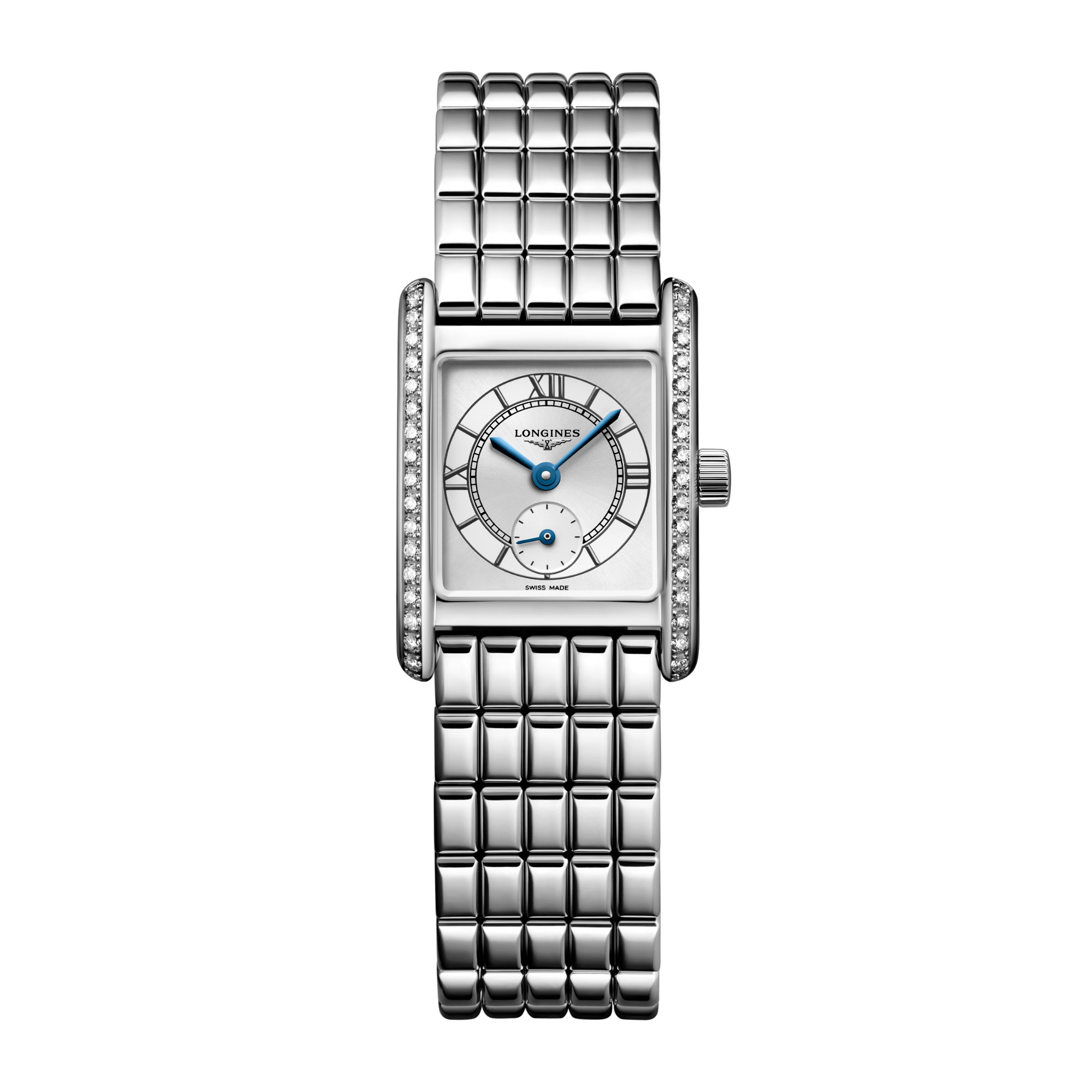 Ref. L5.200.0.75.6 - Die Mini DolceVita mag zwar klein sein, aber dafür kündigt sie ihre Ankunft umso größer an. Mit ihrem dezenten Profil, dem klassischen Design und den ästhetischen Variationen, die zugleich modern und zeitlos sind, ist sie ein kleines, aber mächtiges Meisterstück, das den unaufdringlichen Luxus und die zeitgenössische Eleganz von Longines gleichermaßen hervorragend zum Ausdruck bringt. Jede Referenz der Mini DolceVita Kollektion besitzt ein rechteckiges 21,50 mm x 29,00 mm großes Edelstahlgehäuse und wird von einem höchst präzisen L178 Quarz-Uhrwerk angetrieben.Das Highlight der neuen Mini DolceVita Kollektion besticht durch ein Gehäuse, das von 38 IF-VVS Top Wesselton Diamanten umrahmt ist. Das kreisförmige Cosmo-Zifferblatt im Inneren des rechteckigen Gehäuses unterstreicht die unnachahmliche Eleganz der Uhr.Die Uhr ist an einem neu kreierten Edelstahlarmband befestigt, das mit seinen 198 Gliedern den edlen Charakter der Uhr hervorhebt und einen hervorragenden Tragekomfort bietet.