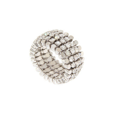Ref. S.RB 5M4 WG WD - Die patentierten Multi-Size Ringe sind wahre Verwandlungskünstler. Durch die Kombination aus traditioneller italienischer Juwelenkunst und fortschrittlicher Ingenieurskunst entstehen Ringe, die sich in der Größe spielend leicht verändern lassen. Die vielseitig kombinierbaren Schmuckstücke bestechen außerdem mit ihrer herausragenden Qualität und der Verarbeitung ausschließlich feinster Materialien. Ob als breiter Ring am Ringfinger oder als Eyecatcher am Zeigefinger, die vielseitig kombinierbaren Schmuckstücke aus feinsten Materialien sind in sekundenschnelle wandelbar. - Der abgebildete Ring ist aus 750/- Weißgold gefertigt und in der Mitte ausgefasst Brillanten.