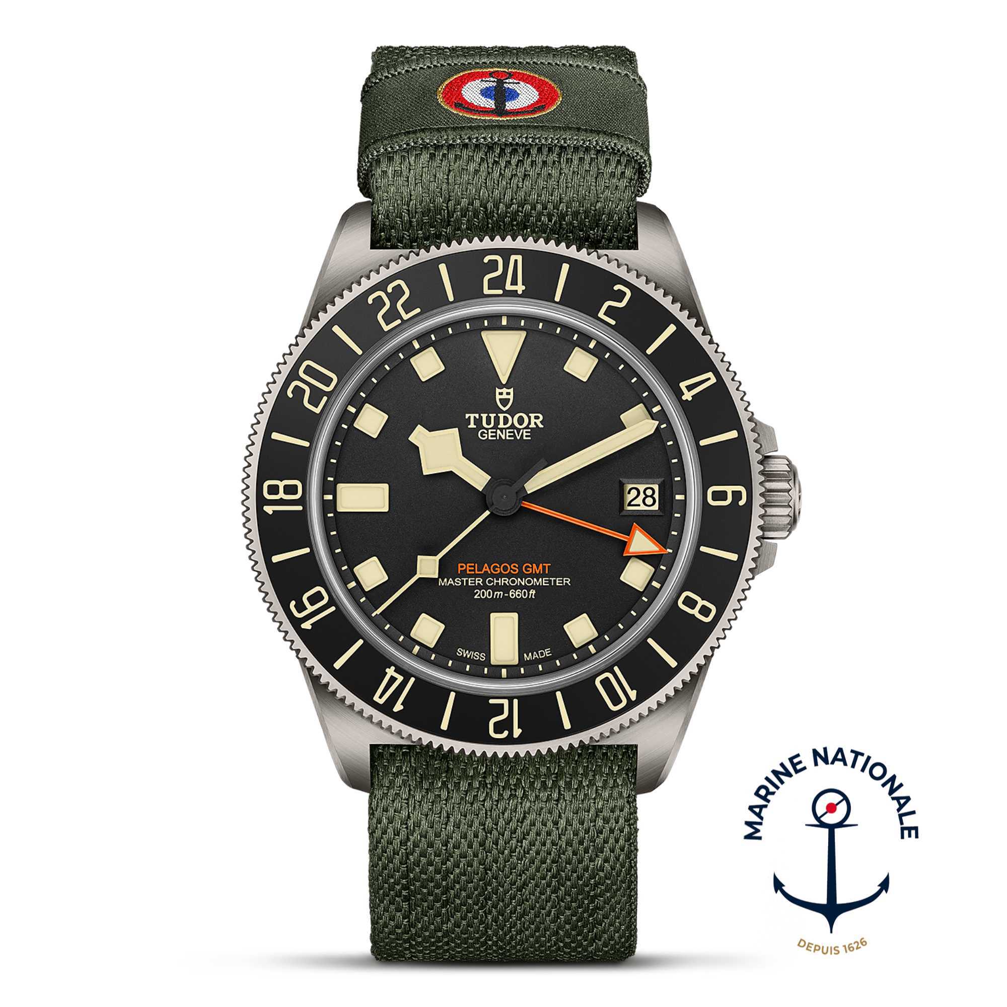 Lünette aus Titan, beidseitig drehbar mit schwarzer Keramikzahlenscheibe und 24-Stunden-Graduierung