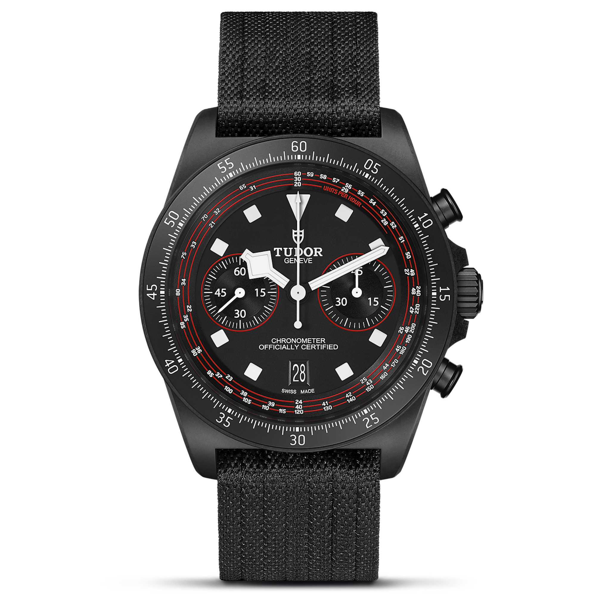 Beim mattschwarzen Zifferblatt mit roten Akzenten steht vor allem die Ablesbarkeit im Vordergrund. Seine Farbgebung erinnert an die Farben des TUDOR Pro Cycling Teams. Die charakteristischen quadratischen Stundenindizes und „Snowflake“-Zeiger, die in den 1960er-Jahren von TUDOR entworfen wurden, sind aus leuchtender Monoblock-Keramik hergestellt, die eine optimale Ablesbarkeit unter herausfordernden Bedingungen garantiert.