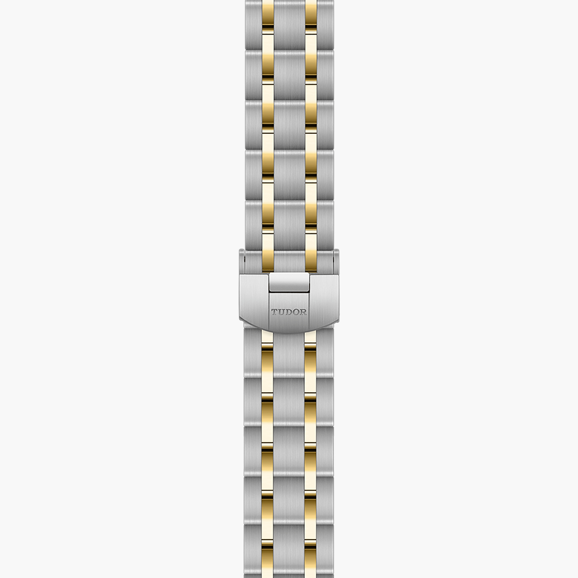 Integiertes Armband aus Edelstahl 316L und 18K Gelbgold mit Sicherheitsfaltschließe, fünfreihig, satinierte Elemente außen und innen, polierte Elemente dazwischen