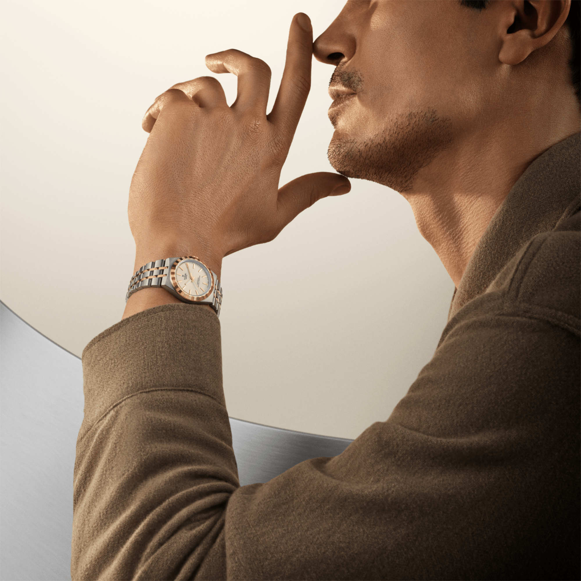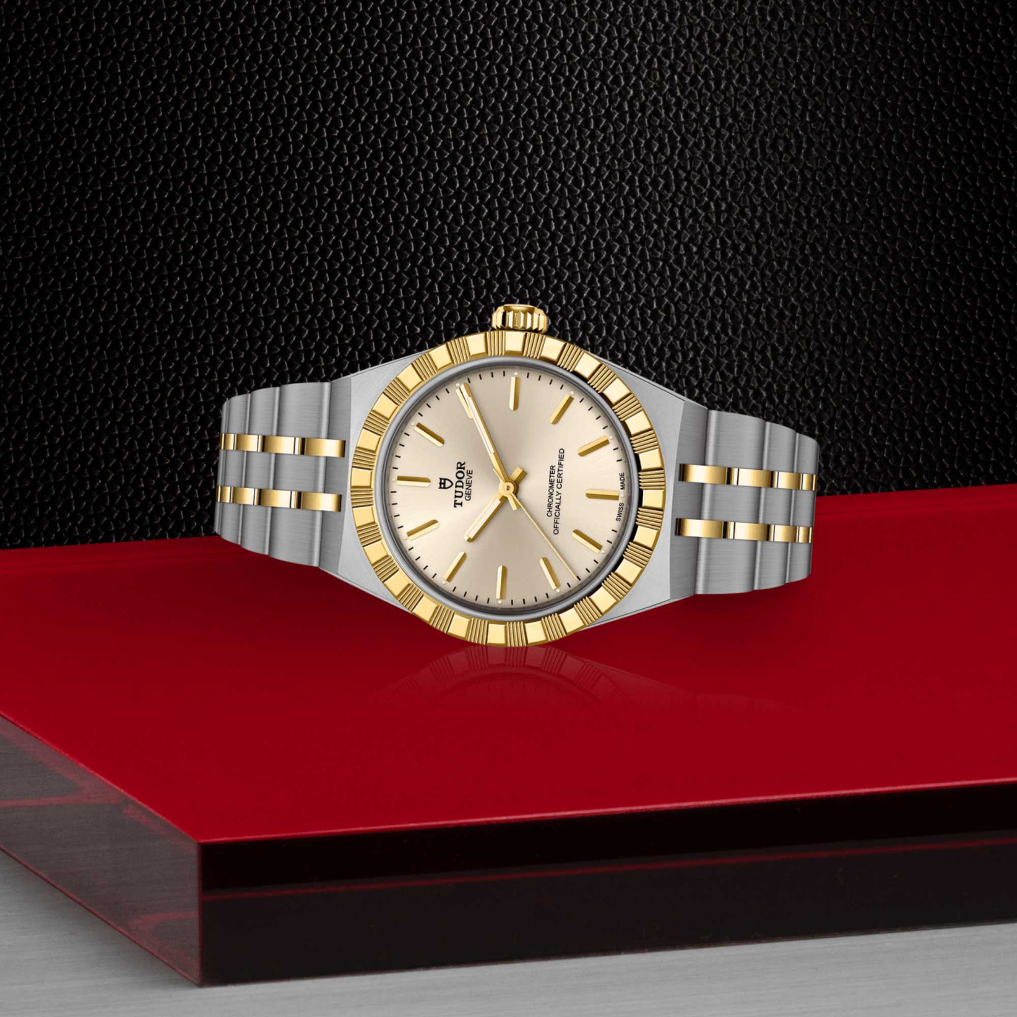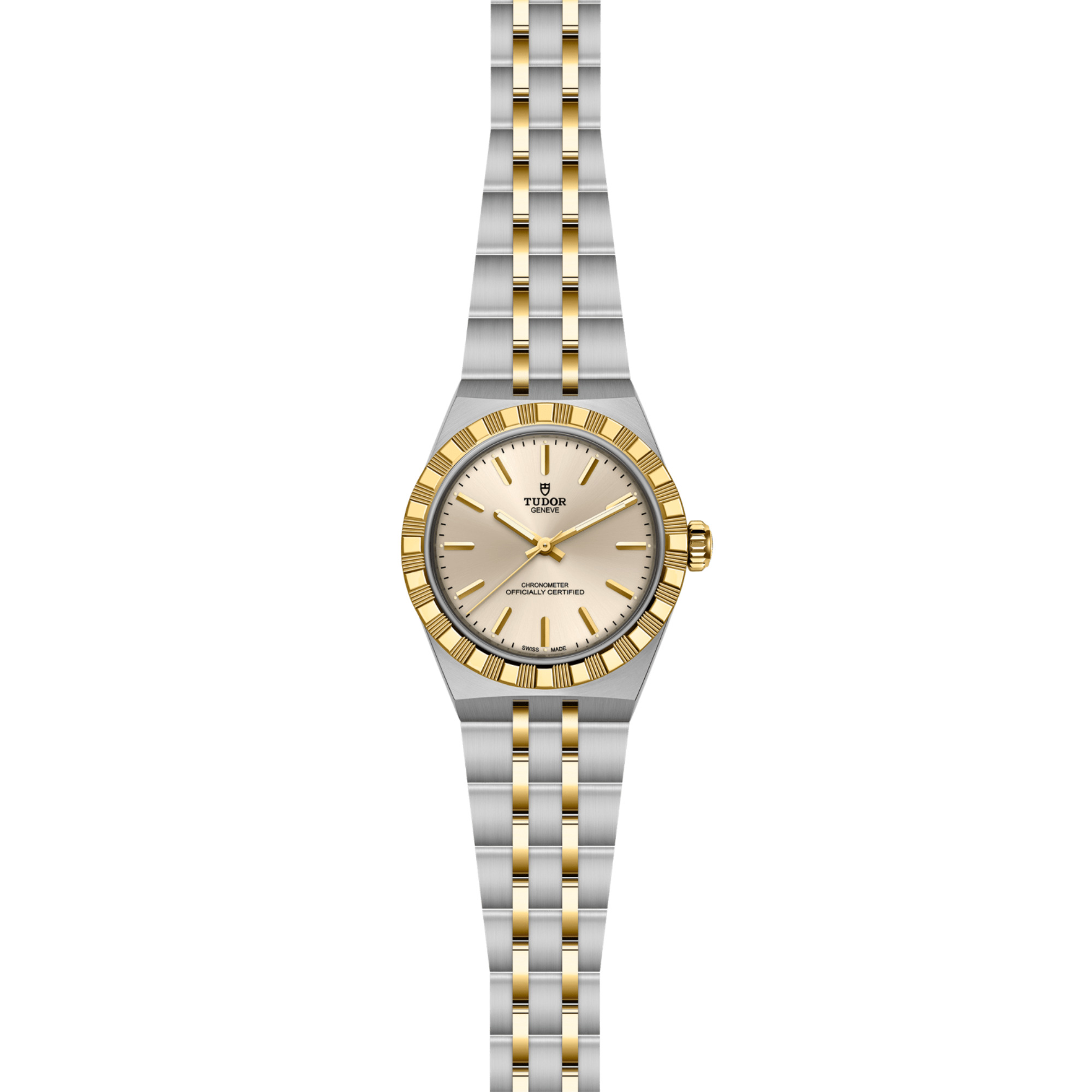 Ref. M2830A1A3-0003 - Mit ihrem integrierten Metallarmband, das nahtlos in das Gehäuse übergeht, zeichnet sich die TUDOR Royal durch ein fließendes und stilsicheres Design aus. Charakterisiert durch ihre drei breiten satinierten Bandelemente, zwischen denen zwei schmalere polierte Elemente positioniert sind, und ihre „T-fit“-Schließe, betont die glatte Beschaffenheit ihrer Oberflächen die große Aufmerksamkeit, die TUDOR dem Tragekomfort schenkt. Erhältlich in Edelstahl oder mit abwechselnden Elementen in Edelstahl und Gelbgold, sprechen die Modelle dieser Linie mit ihrer fein bearbeiteten Oberfläche jeden Geschmack an.
