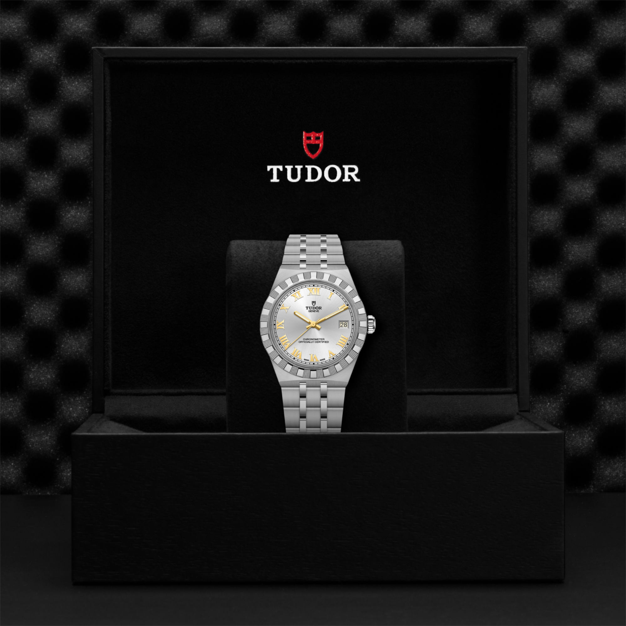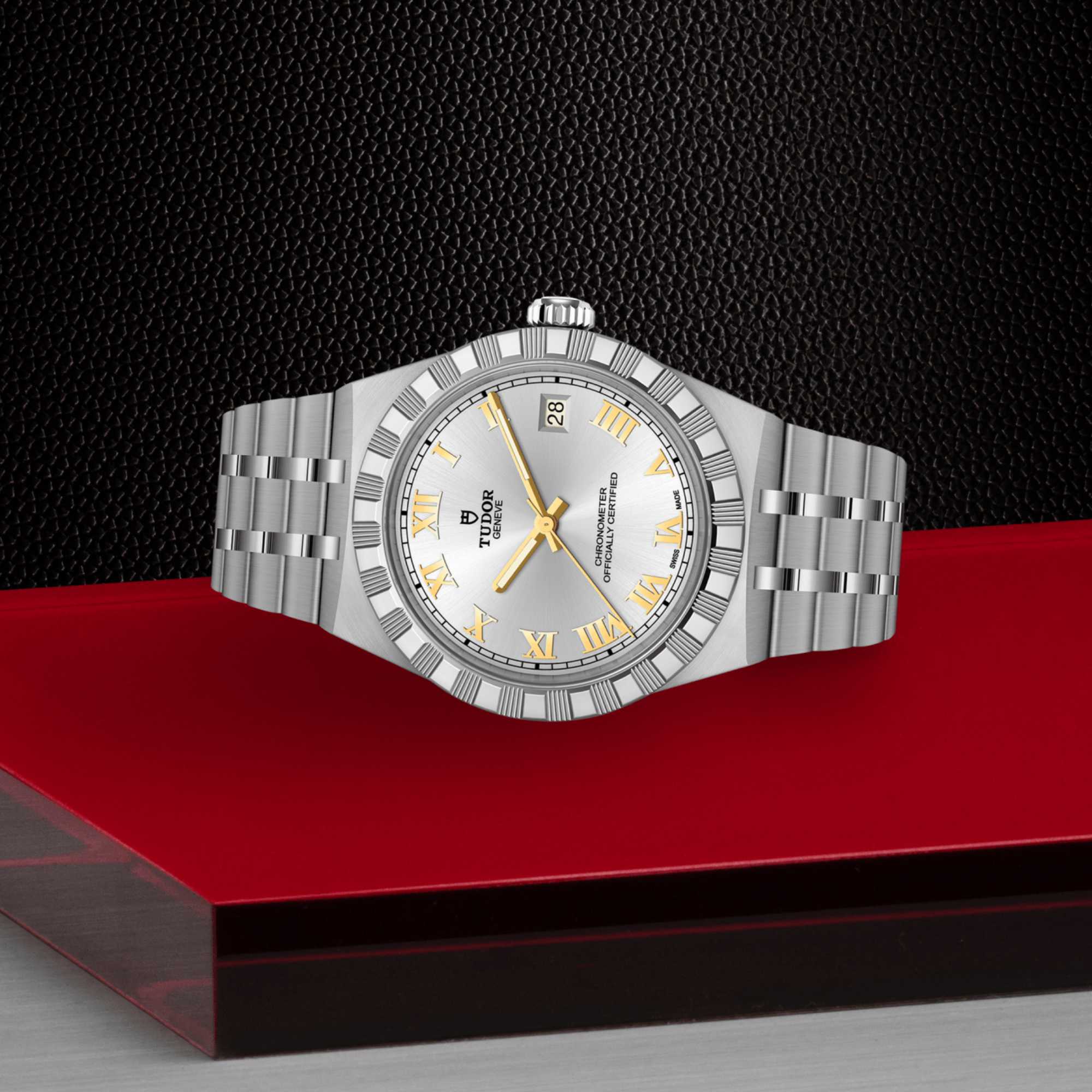 Ref. M2836C1A0-0104 - Mit ihrem integrierten Metallarmband, das nahtlos in das Gehäuse übergeht, zeichnet sich die TUDOR Royal durch ein fließendes und stilsicheres Design aus. Charakterisiert durch ihre drei breiten satinierten Bandelemente, zwischen denen zwei schmalere polierte Elemente positioniert sind, und ihre „T-fit“-Schließe, betont die glatte Beschaffenheit ihrer Oberflächen die große Aufmerksamkeit, die TUDOR dem Tragekomfort schenkt. Erhältlich in Edelstahl oder mit abwechselnden Elementen in Edelstahl und Gelbgold, sprechen die Modelle dieser Linie mit ihrer fein bearbeiteten Oberfläche jeden Geschmack an.