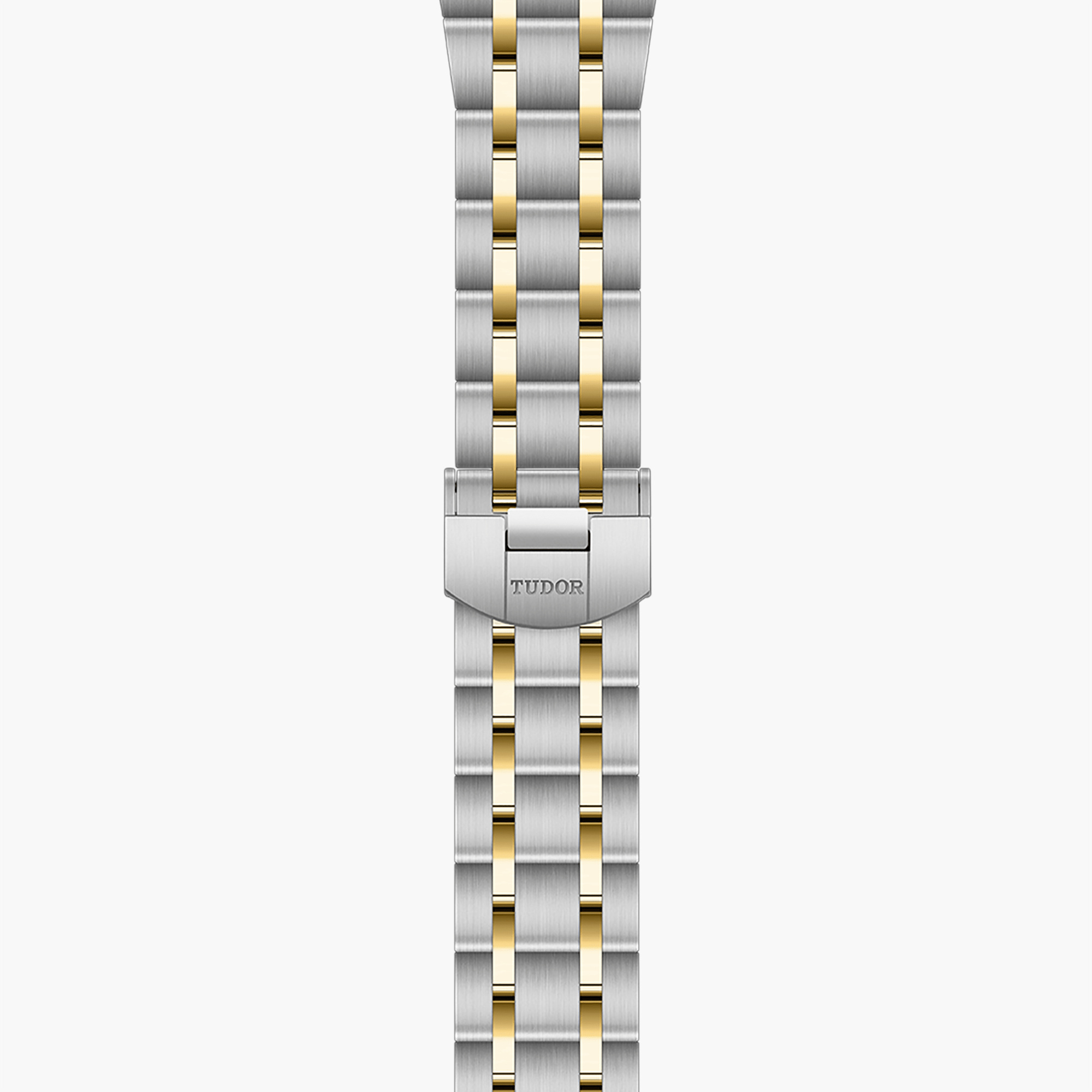 Integiertes Armband aus Edelstahl 316L und 18K Gelbgold mit Sicherheitsfaltschließe, fünfreihig, satinierte Elemente außen und innen, polierte Elemente dazwischen