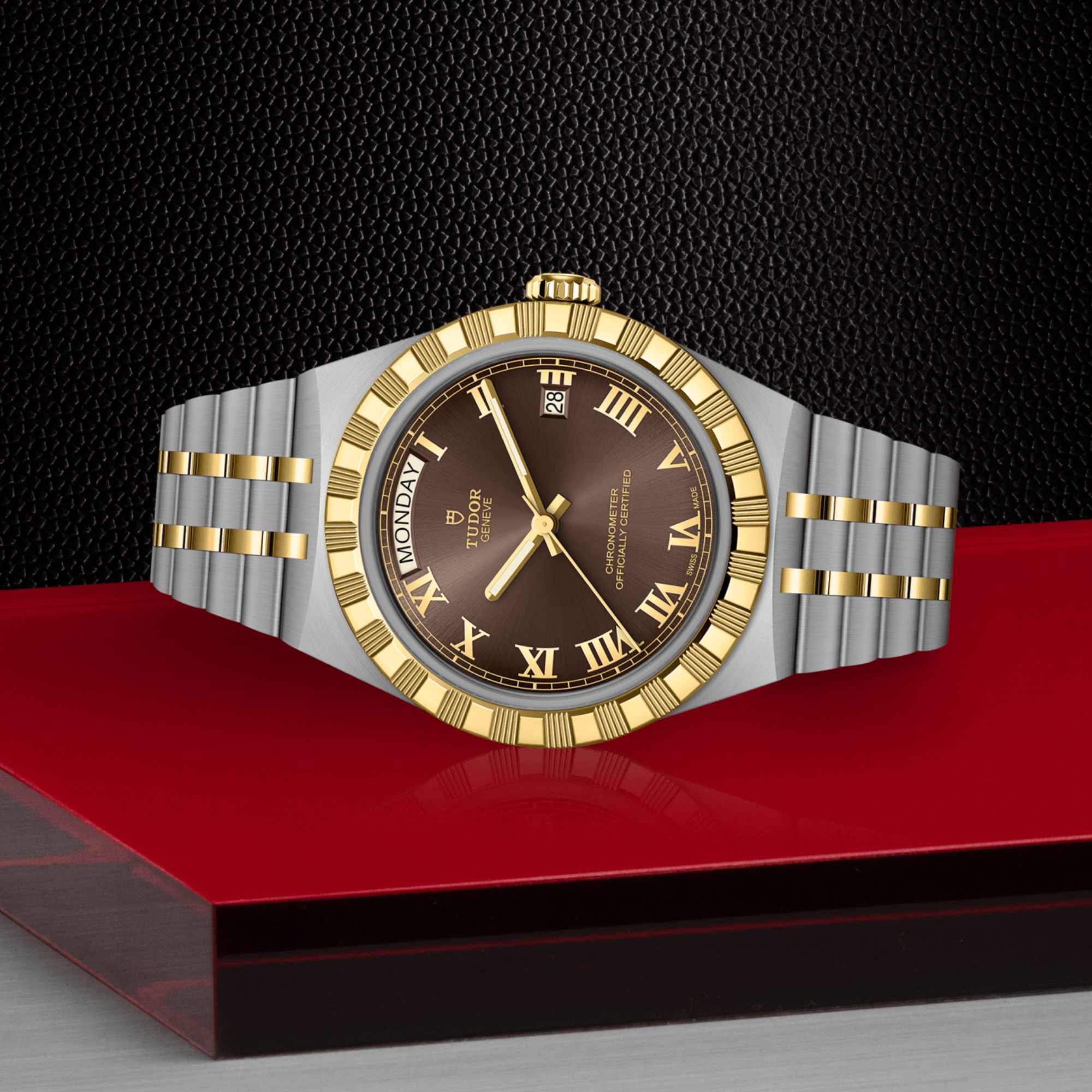 Ref. M2840D1A3-0001 - Mit ihrem integrierten Metallarmband, das nahtlos in das Gehäuse übergeht, zeichnet sich die TUDOR Royal durch ein fließendes und stilsicheres Design aus. Charakterisiert durch ihre drei breiten satinierten Bandelemente, zwischen denen zwei schmalere polierte Elemente positioniert sind, und ihre „T-fit“-Schließe, betont die glatte Beschaffenheit ihrer Oberflächen die große Aufmerksamkeit, die TUDOR dem Tragekomfort schenkt. Erhältlich in Edelstahl oder mit abwechselnden Elementen in Edelstahl und Gelbgold, sprechen die Modelle dieser Linie mit ihrer fein bearbeiteten Oberfläche jeden Geschmack an.