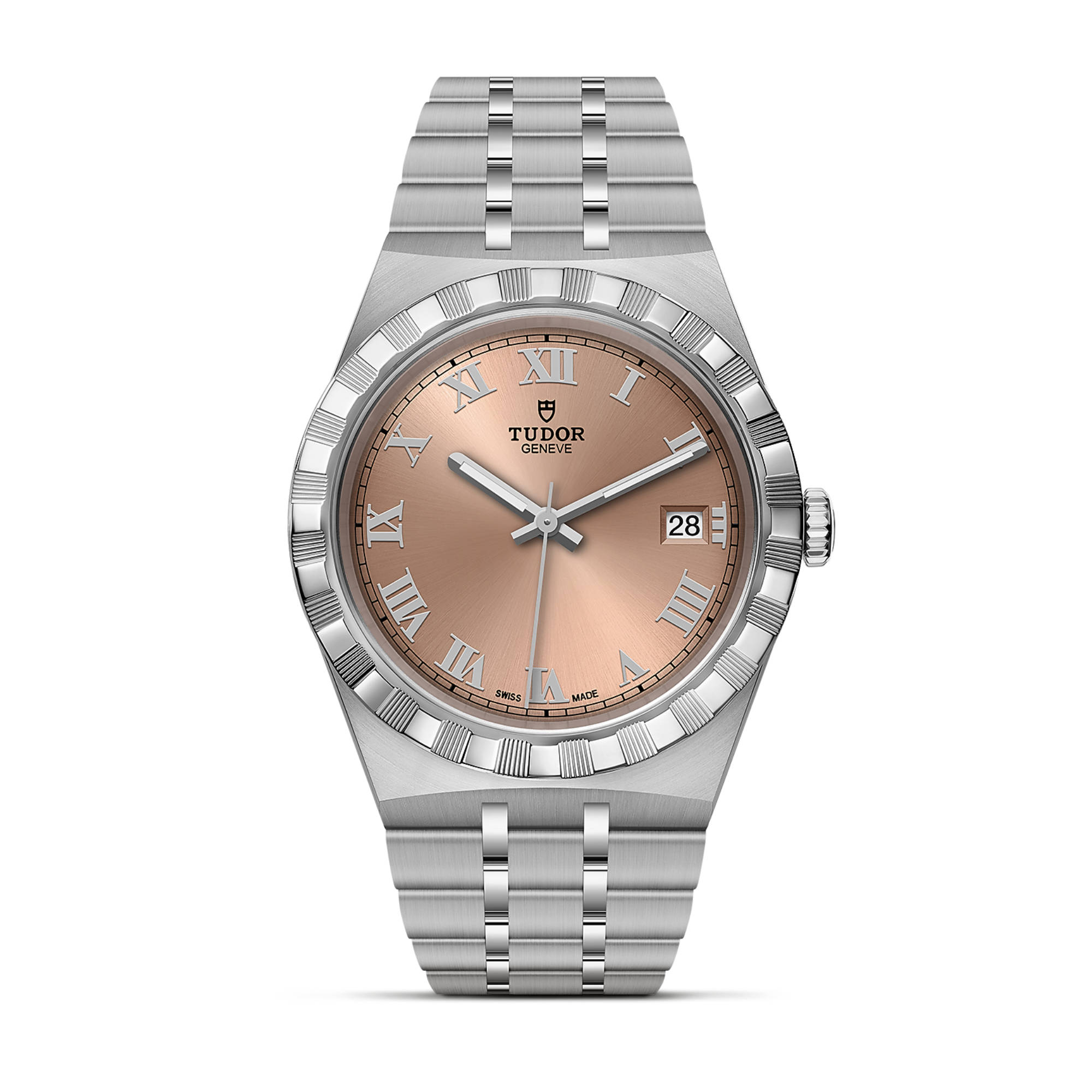 Ref. M28500-0007 - TUDOR hat die Auswahl an Zifferblättern der beliebten Royal Linie um ein lachs- sowie ein schokoladenfarbenes Zifferblatt im Sonnenschliff erweitert, die durch eine überraschende und erlesene Optik überzeugen. Die Royal Linie bietet sportliche und schicke Uhren mit Selbstaufzug sowie integrierten Armbändern, die sich durch Erschwinglichkeit und Eleganz gleichermaßen auszeichnen. Eine herausragende technische Leistung und eine raffinierte Ästhetik; diese Linie verkörpert eine Mischung aus klassischer Armbanduhr und Sportuhr. Der Name „Royal“ wurde von TUDOR erstmals in den 1950er-Jahren verwendet, um die herausragende Qualität seiner Armbanduhren hervorzuheben, die bis heute Bestand hat. Die Royal ist in Edelstahl oder in Gelbgold und Edelstahl sowie in vier Größen mit insgesamt dreizehn verschiedenen Zifferblättern für jeden Geschmack erhältlich. Alle Zifferblätter verfügen über diese applizierten Ziffern oder eine Kombination aus applizierten Ziffern und acht Diamantindizes.