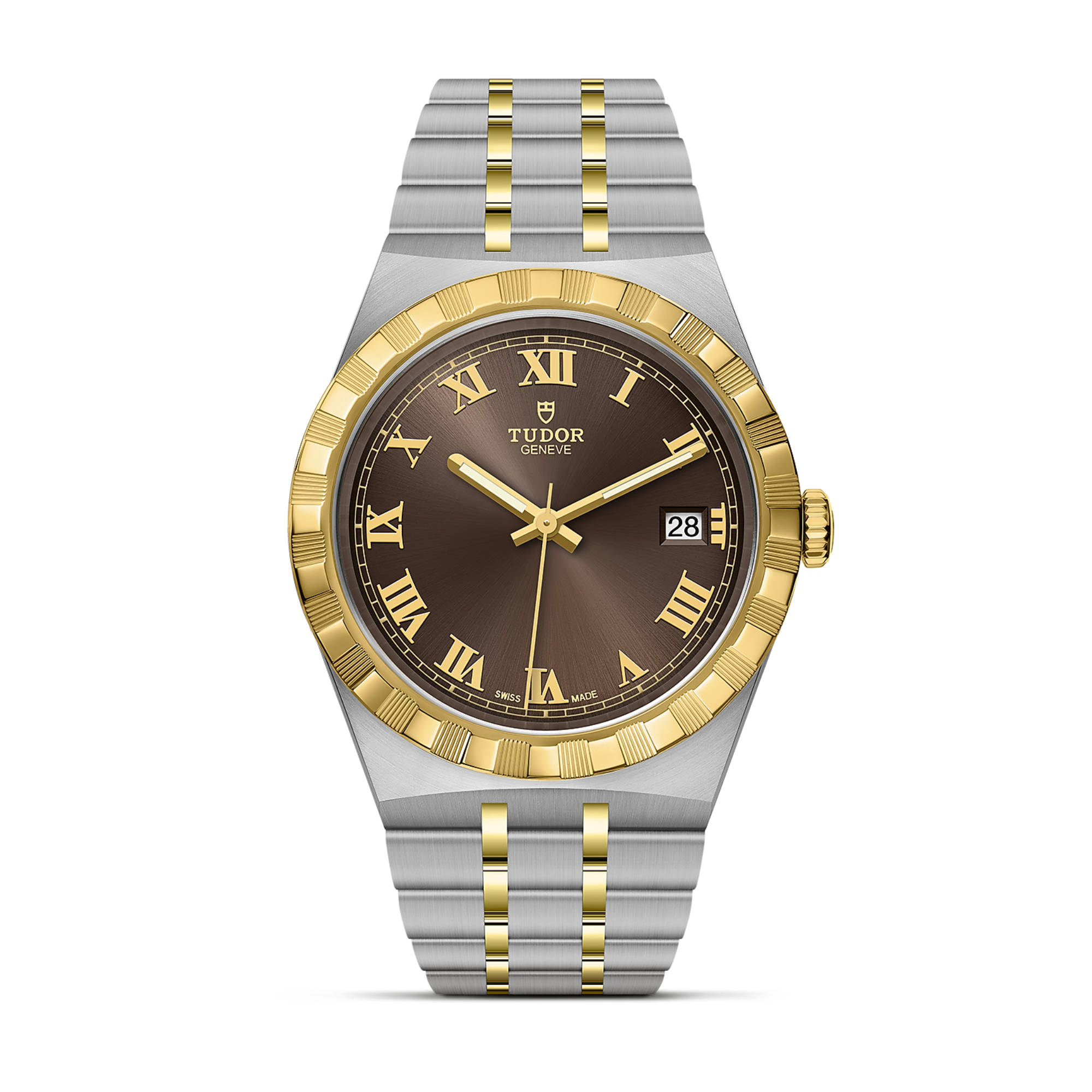 Ref. M28503-0007 - TUDOR hat die Auswahl an Zifferblättern der beliebten Royal Linie um ein lachs- sowie ein schokoladenfarbenes Zifferblatt im Sonnenschliff erweitert, die durch eine überraschende und erlesene Optik überzeugen. Die Royal Linie bietet sportliche und schicke Uhren mit Selbstaufzug sowie integrierten Armbändern, die sich durch Erschwinglichkeit und Eleganz gleichermaßen auszeichnen. Eine herausragende technische Leistung und eine raffinierte Ästhetik; diese Linie verkörpert eine Mischung aus klassischer Armbanduhr und Sportuhr. Der Name „Royal“ wurde von TUDOR erstmals in den 1950er-Jahren verwendet, um die herausragende Qualität seiner Armbanduhren hervorzuheben, die bis heute Bestand hat. Die Royal ist in Edelstahl oder in Gelbgold und Edelstahl sowie in vier Größen mit insgesamt dreizehn verschiedenen Zifferblättern für jeden Geschmack erhältlich. Alle Zifferblätter verfügen über diese applizierten Ziffern oder eine Kombination aus applizierten Ziffern und acht Diamantindizes.