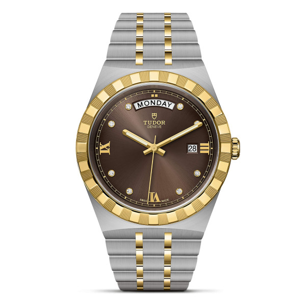 Ref. M28603-0008 - TUDOR hat die Auswahl an Zifferblättern der beliebten Royal Linie um ein lachs- sowie ein schokoladenfarbenes Zifferblatt im Sonnenschliff erweitert, die durch eine überraschende und erlesene Optik überzeugen. Die Royal Linie bietet sportliche und schicke Uhren mit Selbstaufzug sowie integrierten Armbändern, die sich durch Erschwinglichkeit und Eleganz gleichermaßen auszeichnen. Eine herausragende technische Leistung und eine raffinierte Ästhetik; diese Linie verkörpert eine Mischung aus klassischer Armbanduhr und Sportuhr. Der Name „Royal“ wurde von TUDOR erstmals in den 1950er-Jahren verwendet, um die herausragende Qualität seiner Armbanduhren hervorzuheben, die bis heute Bestand hat. Die Royal ist in Edelstahl oder in Gelbgold und Edelstahl sowie in vier Größen mit insgesamt dreizehn verschiedenen Zifferblättern für jeden Geschmack erhältlich. Alle Zifferblätter verfügen über diese applizierten Ziffern oder eine Kombination aus applizierten Ziffern und acht Diamantindizes.