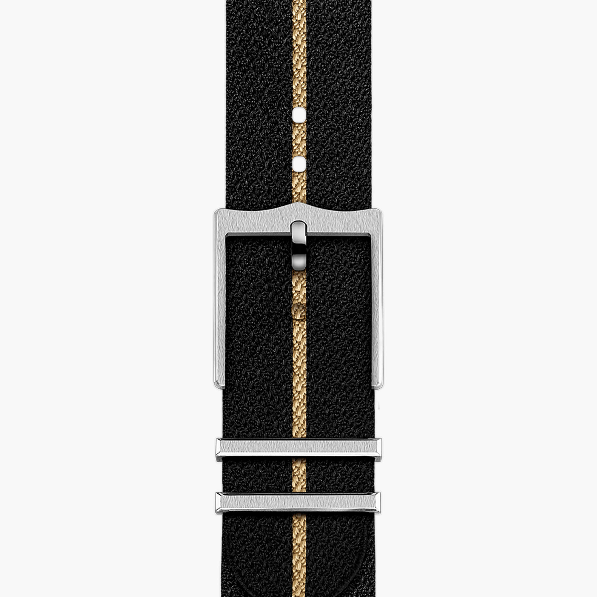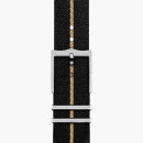 Schwarzes Textilband mit beigefarbenem Streifen und Stiftschließe